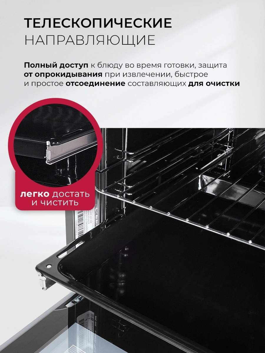 дисплей, полностью стеклянная внутренняя поверхность дверцы духовки, телескопические направляющие
