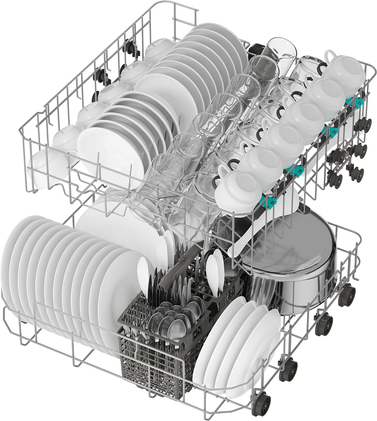 корзина для столовых приборов, полки для кружек, разбрызгиватель над верхней корзиной, регулируемая по высоте корзина для посуды