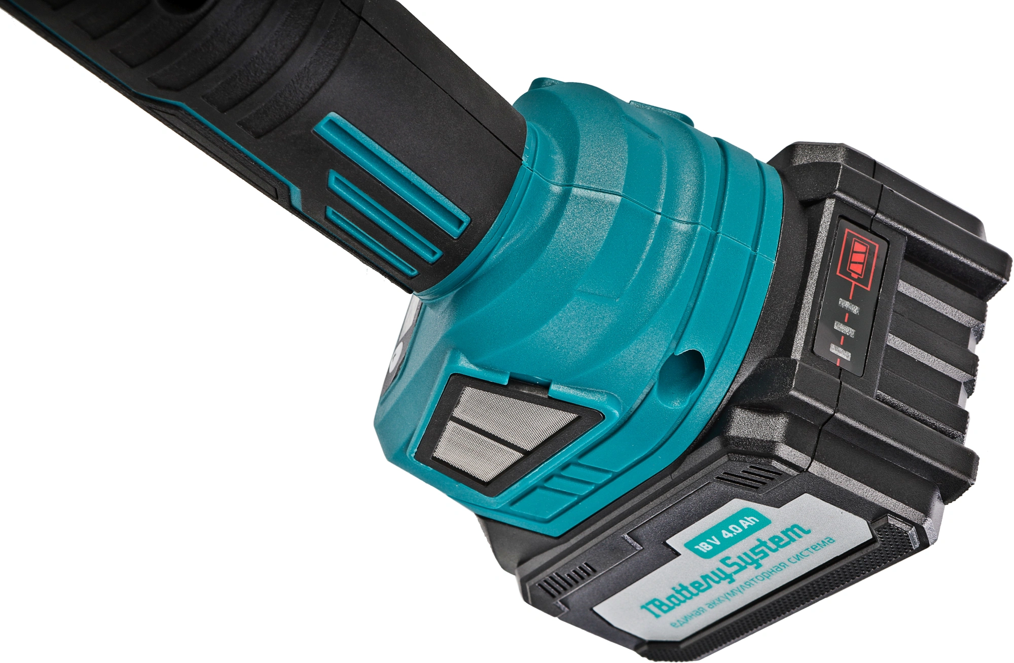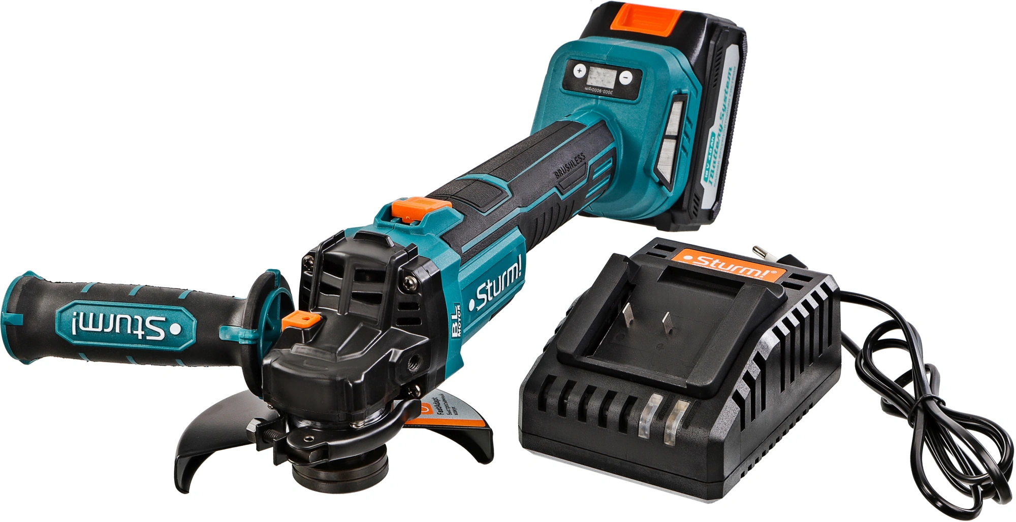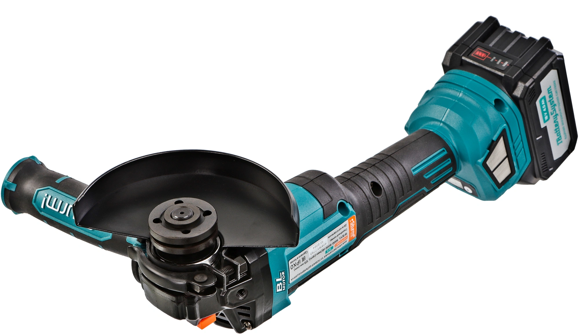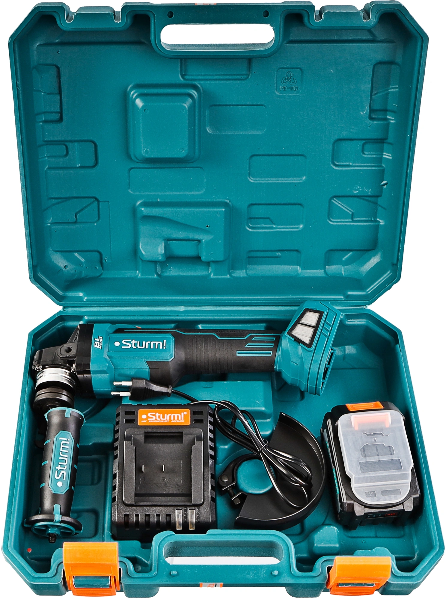 Угловая шлифмашина, зарядное устройство, аккумуляторная батарея, защитный кожух, боковая рукоятка, фланцевый ключ, винт с гайкой.
