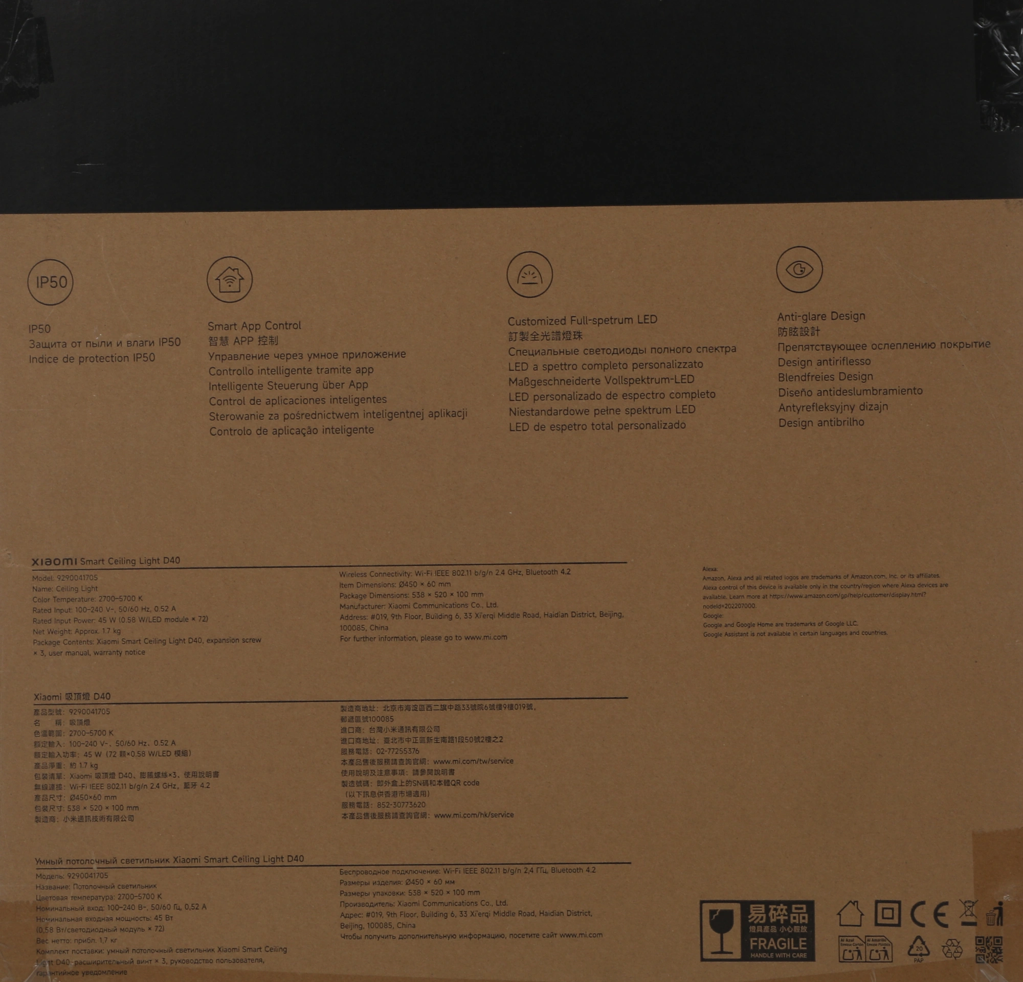 Умный потолочный светильник Xiaomi Smart Ceiling Light D40, 1 шт.; установочный винт, 3 шт.; руководство пользователя, 1 шт.; гарантийный талон, 1 шт.