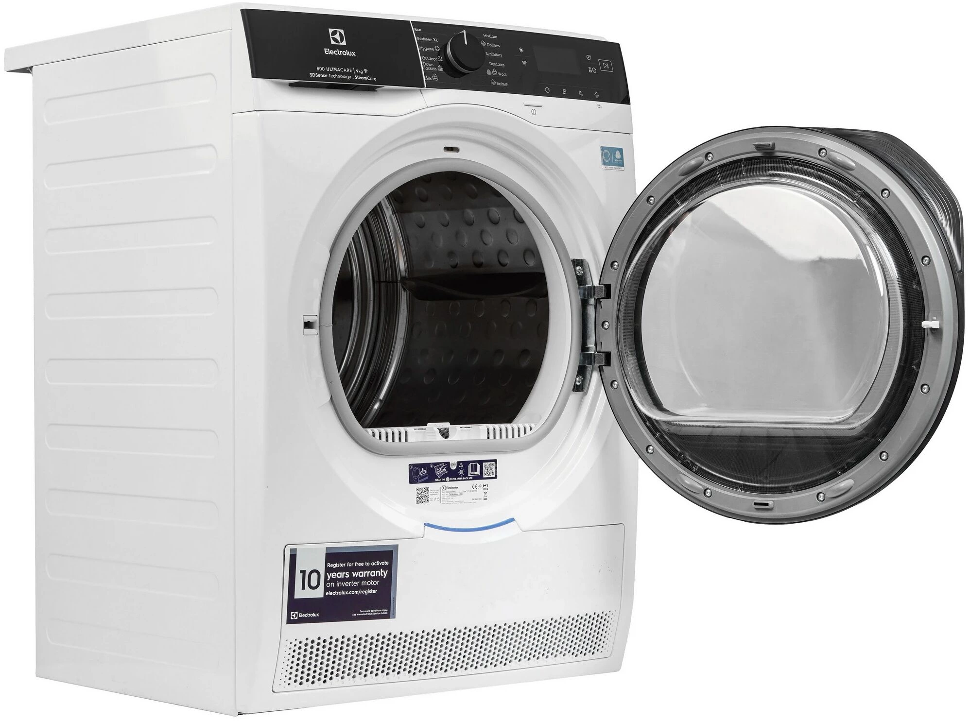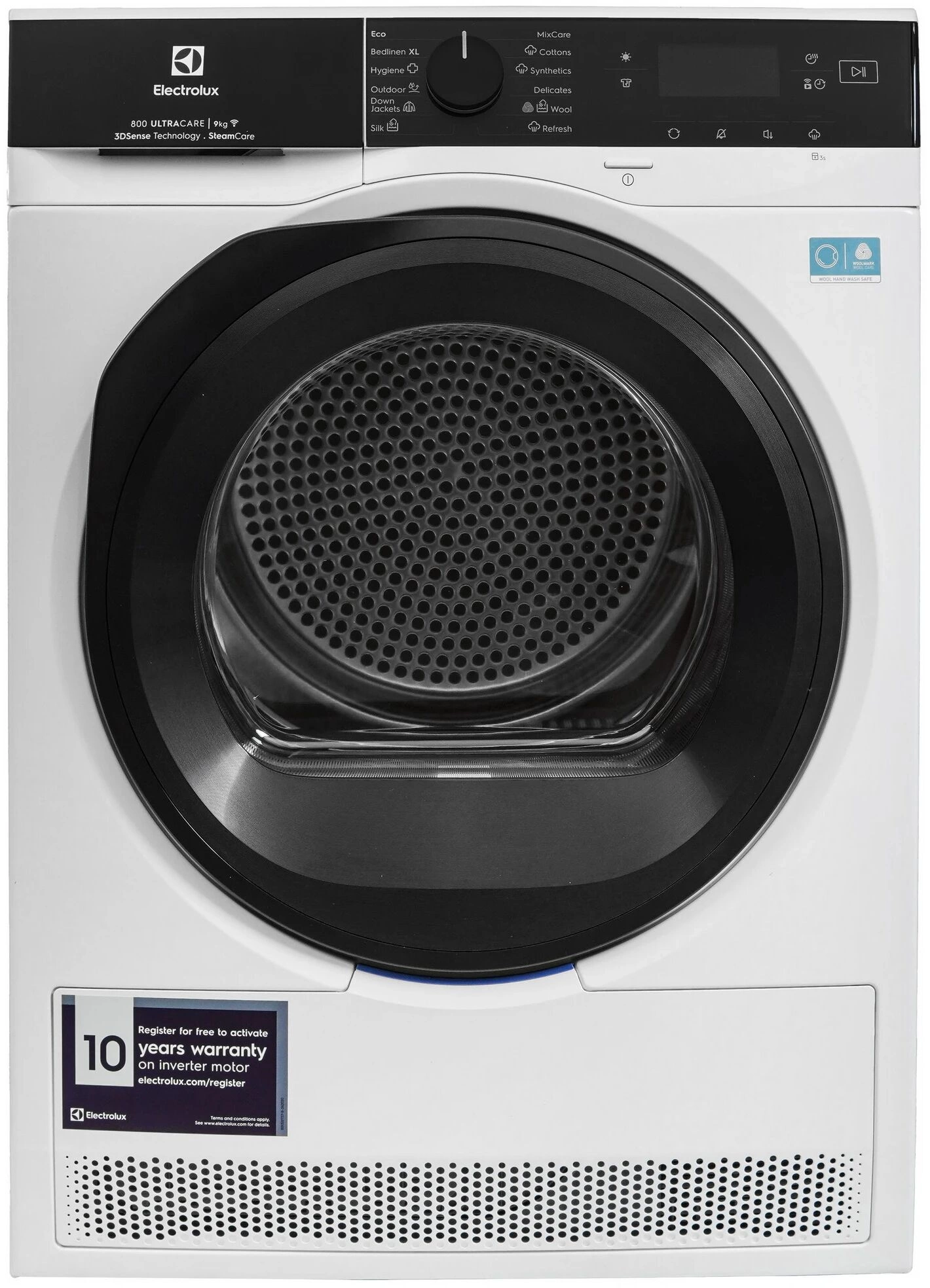 Хлопок. Синтетика. Шерсть. Шелк. Пуховики. Деликатные ткани. Верхняя одежда. Смешанный режим. Постельное белье XL. Регулировка времени / степени сушки.