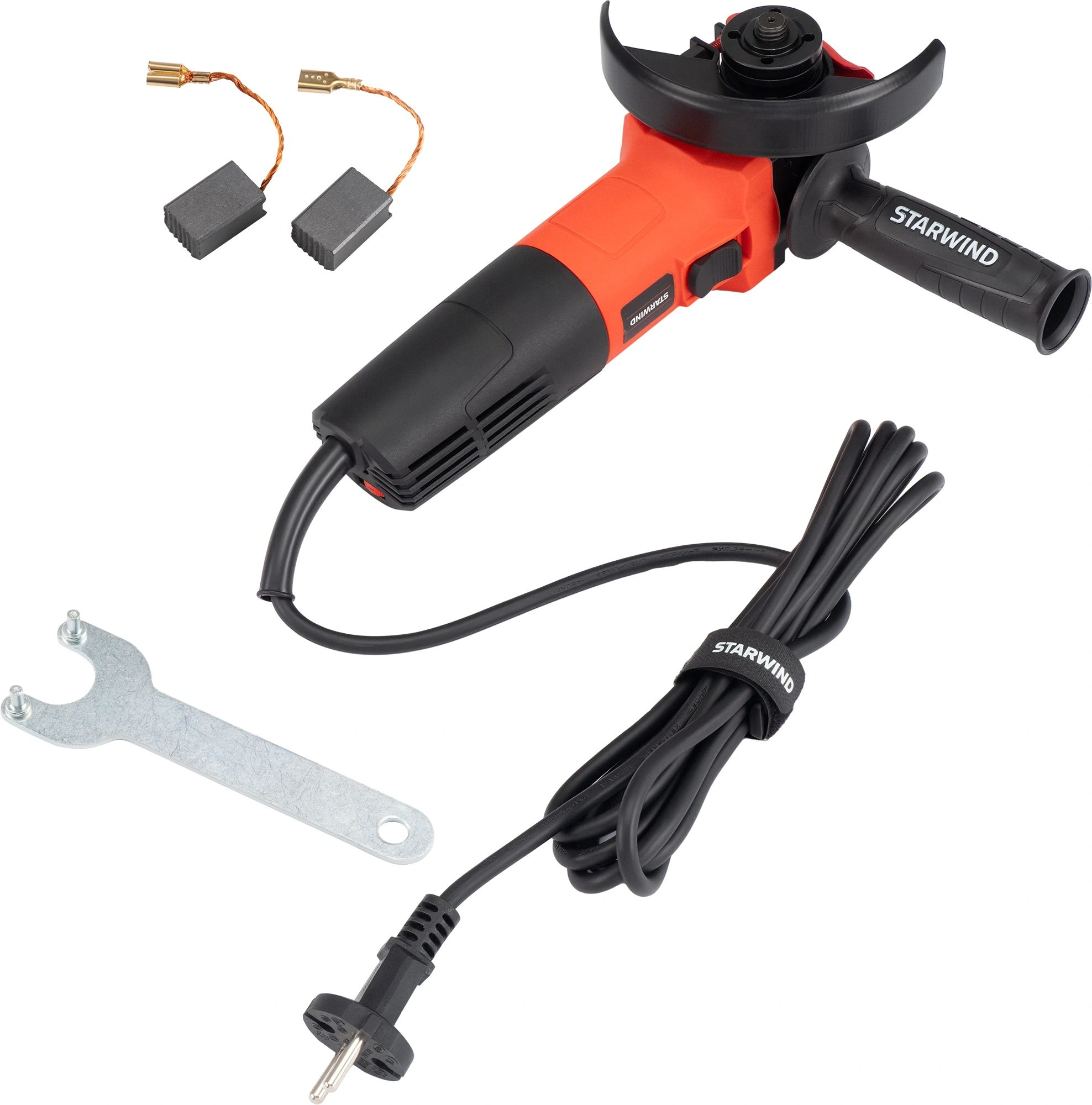 Угловая шлифмашина, дополнительная рукоятка, ключ специальный, угольные щетки - 1 комп, абразивный диск - 2 шт., руководство по эксплуатации, защитный кожух, гарантийный талон.