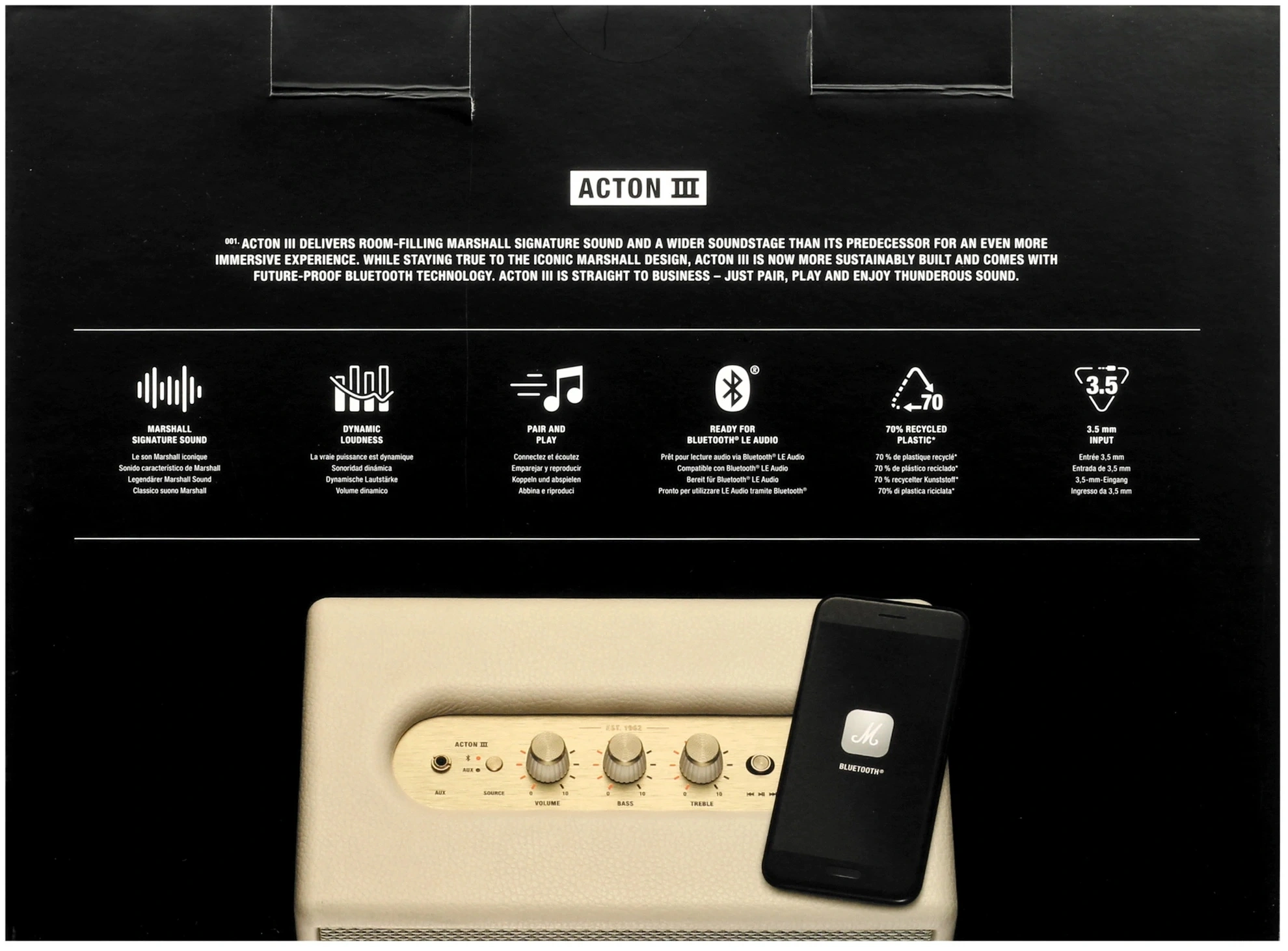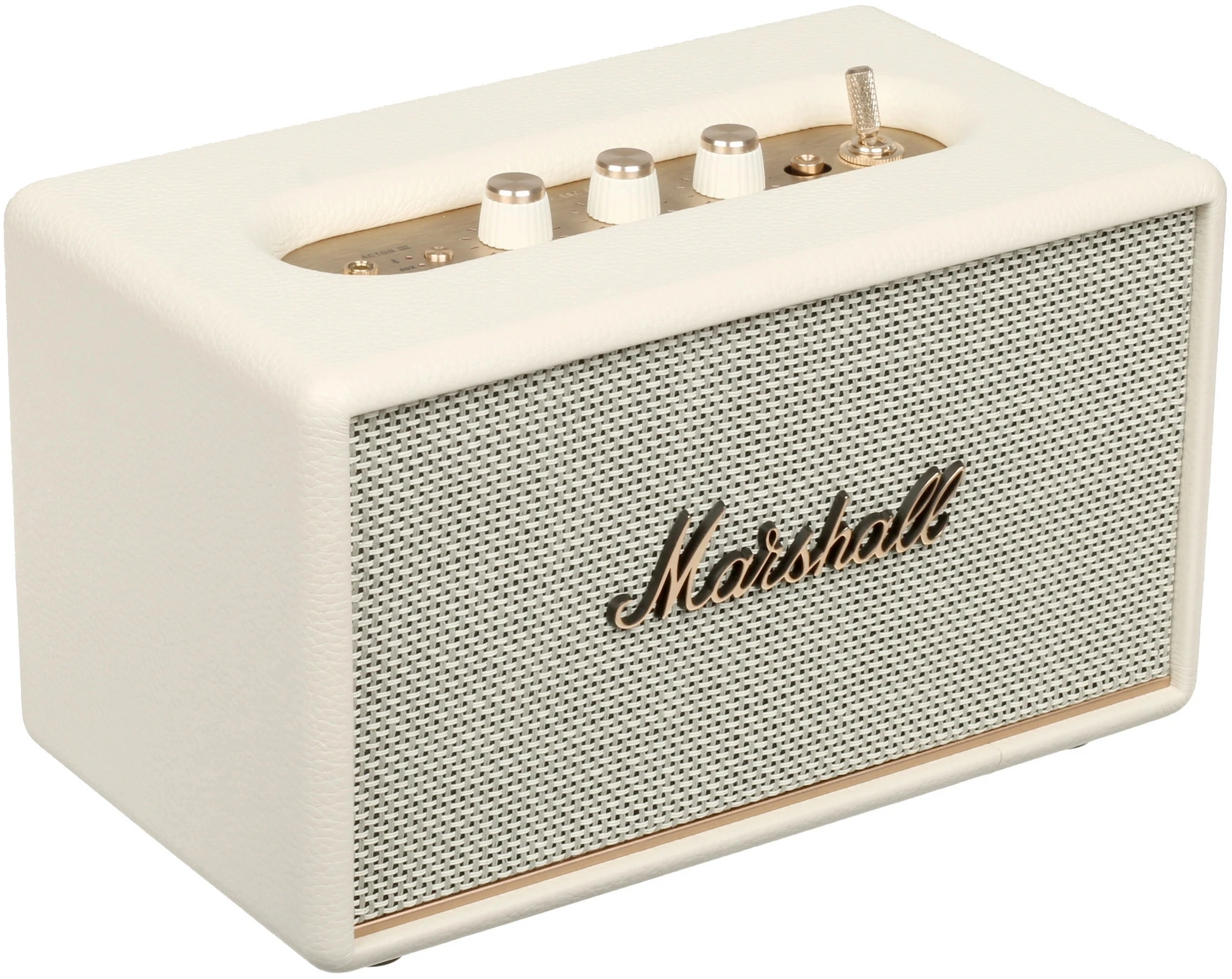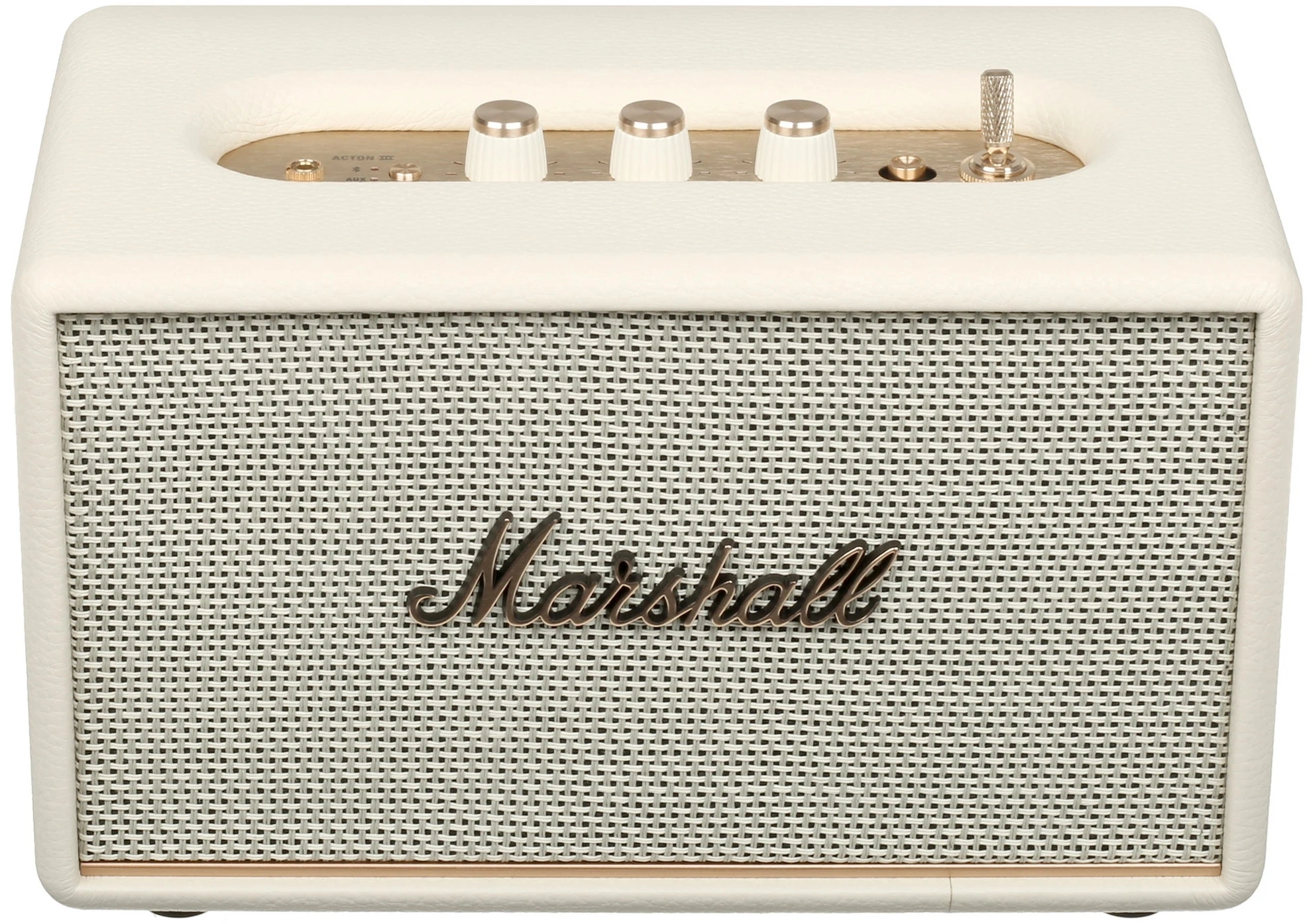 Кнопка выбора источника (Bluetooth или вход 3.5мм). Ручка питания/громкости. Регулятор низких частот. Регулятор высоких частот. Кнопка воспроизведения/паузы. Ручка управления переходом назад/вперед