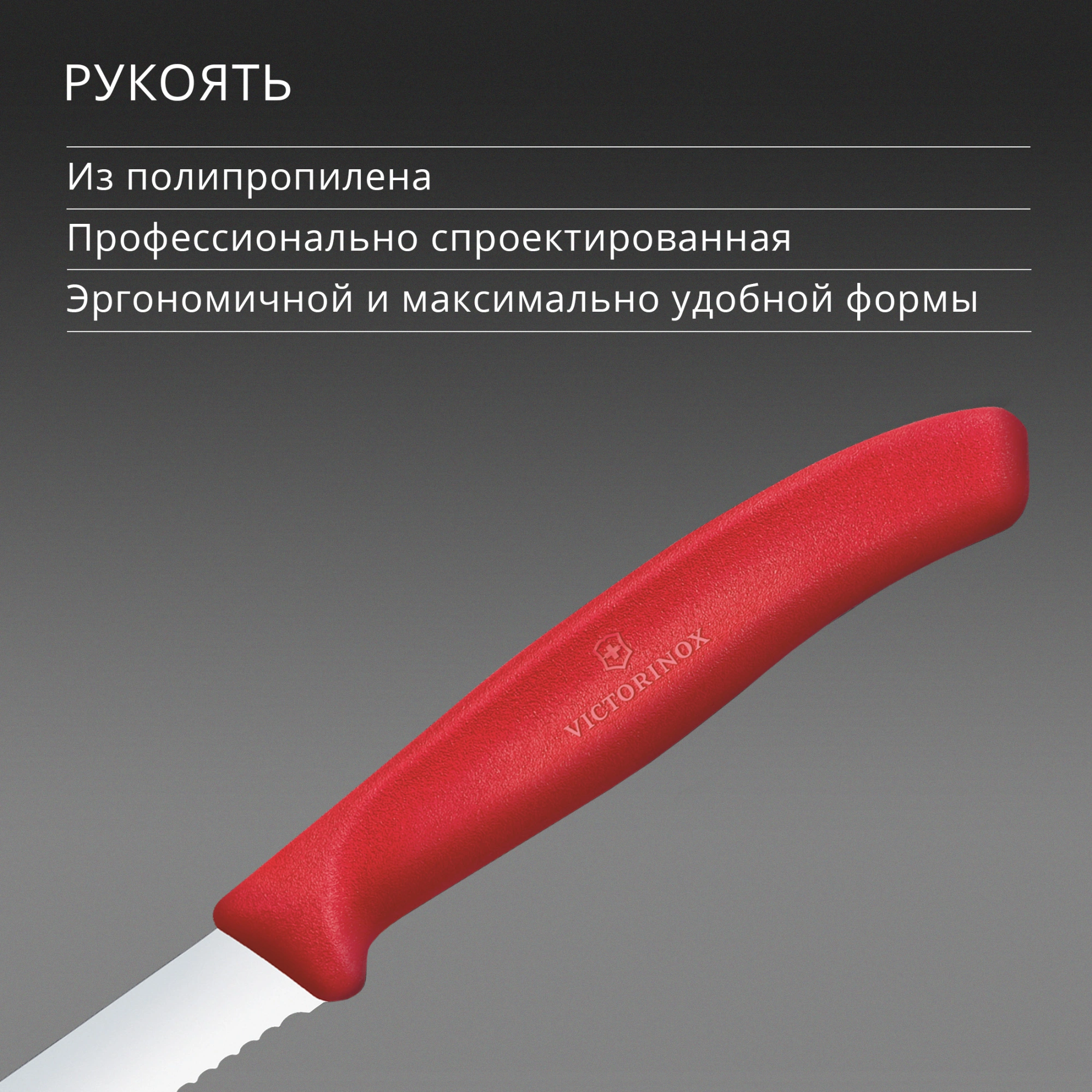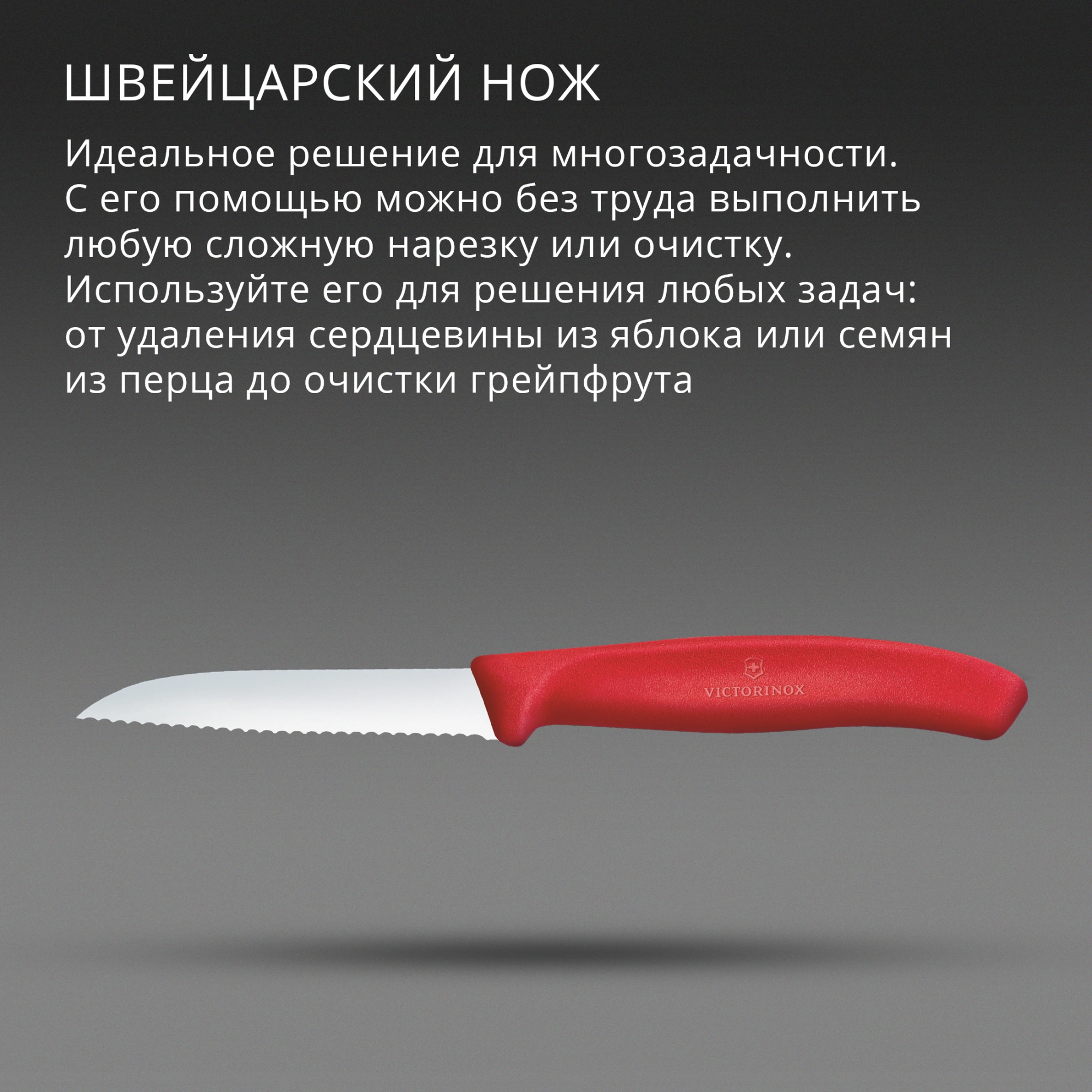 Нож для очистки овощей швейцарского производства с прямым лезвием и серрейторной заточкой.