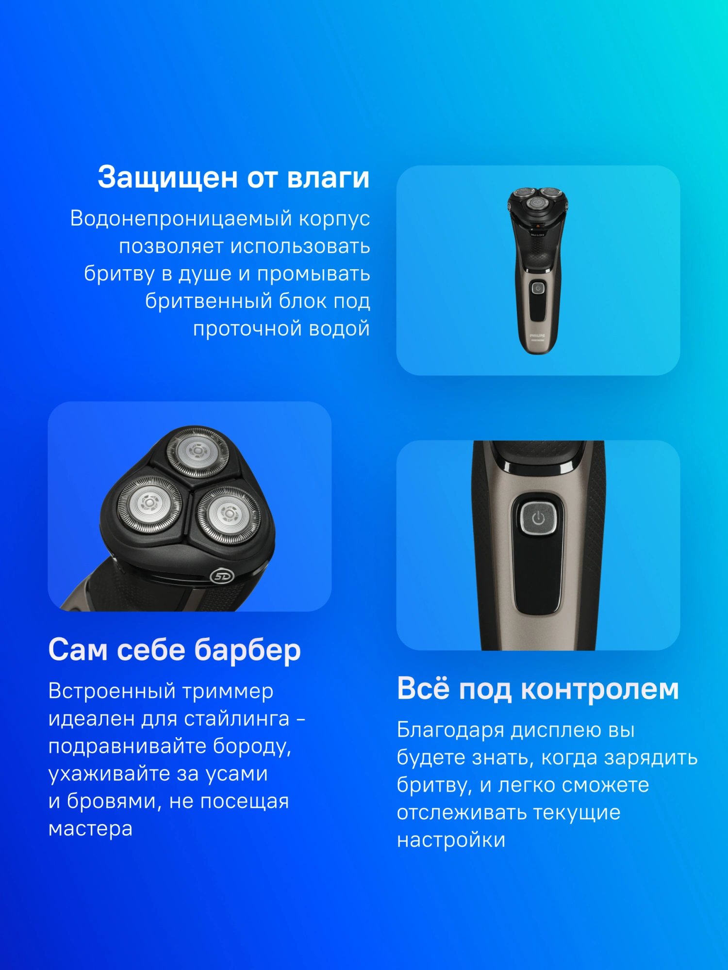 быстрый заряд, подвижный бритвенный блок, промывка ножей под водой
