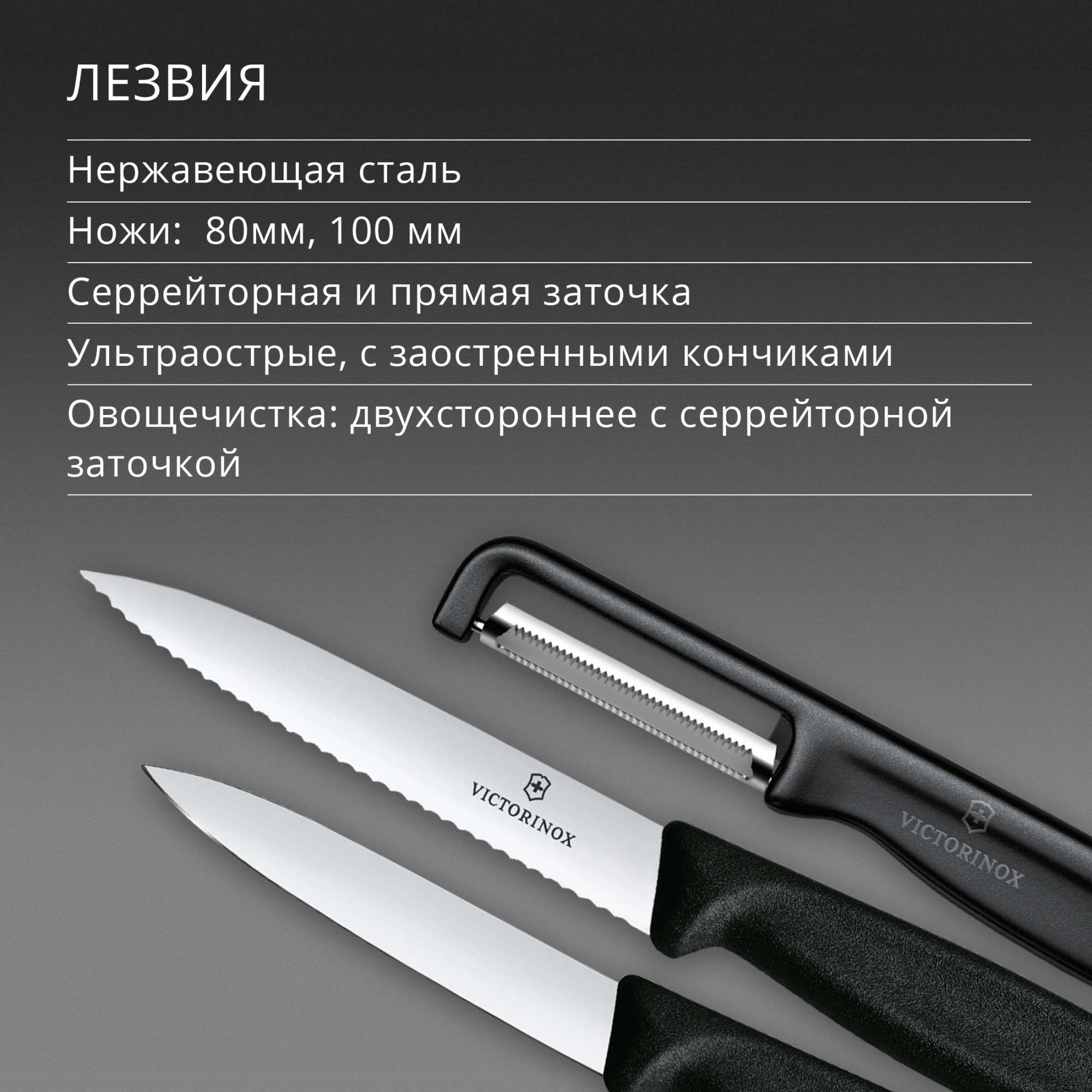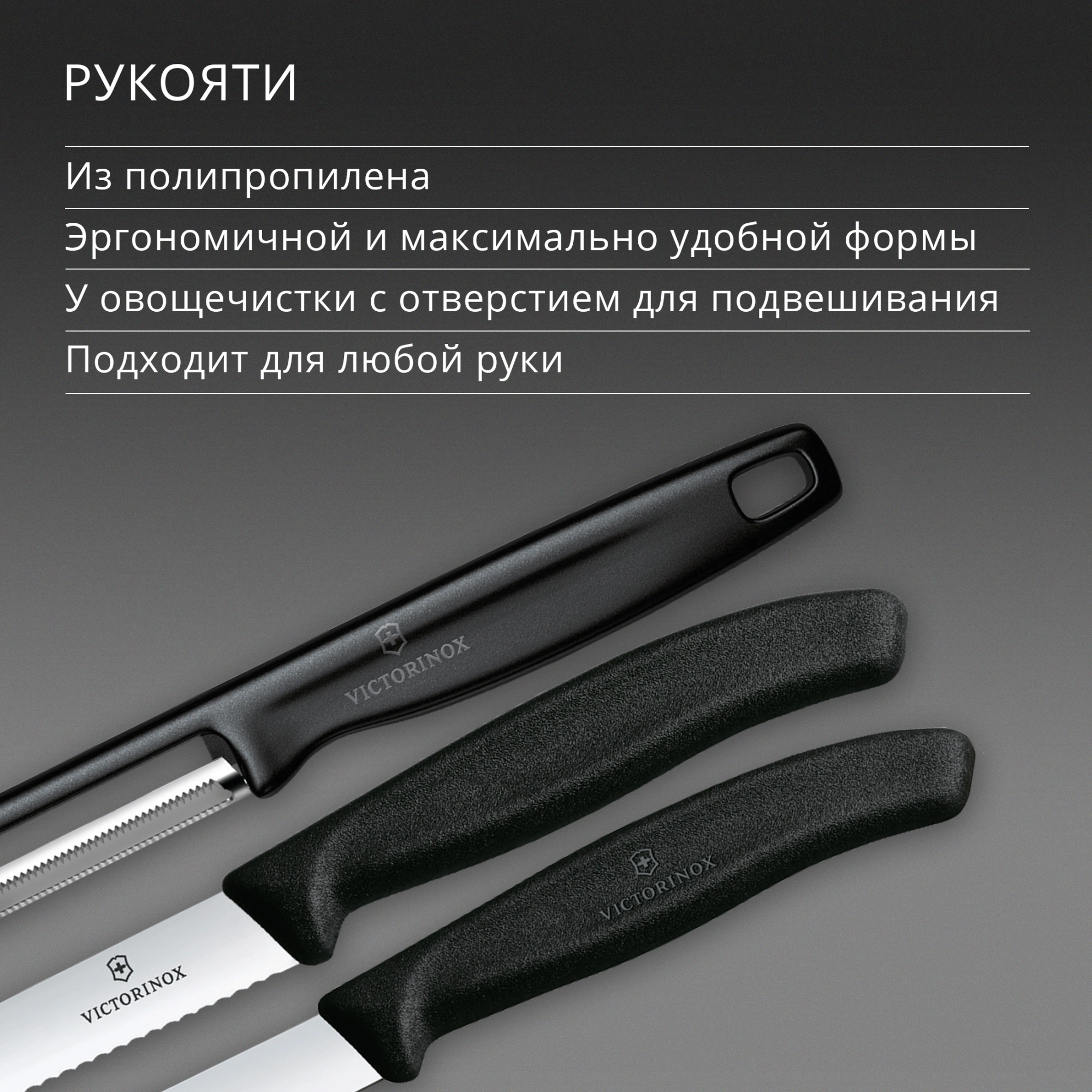 Ножи с ультраострой кромкой и эргономичными ручками, а овощечистка с острым серрейторным лезвием, которое длительное время сохраняет остроту своей кромки.