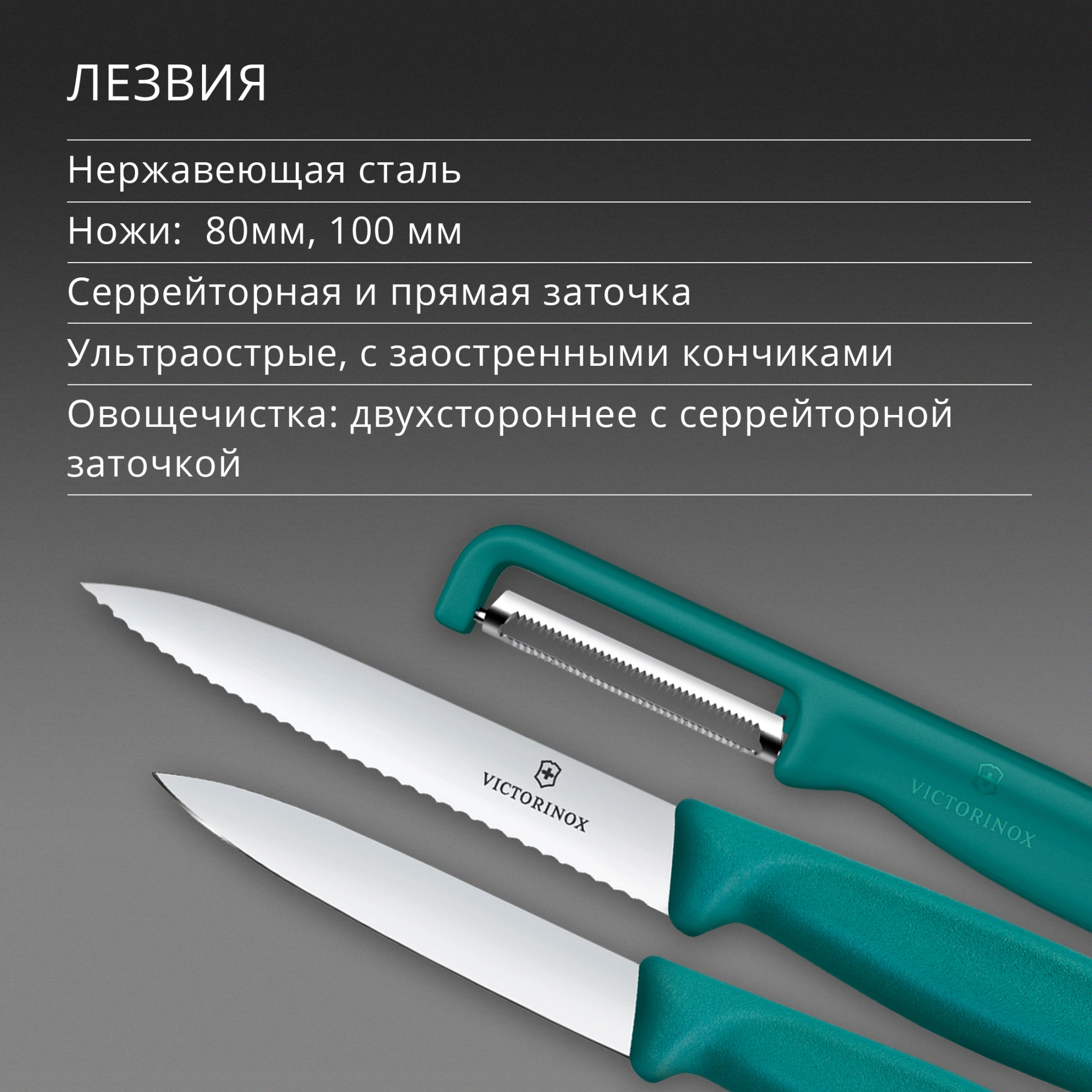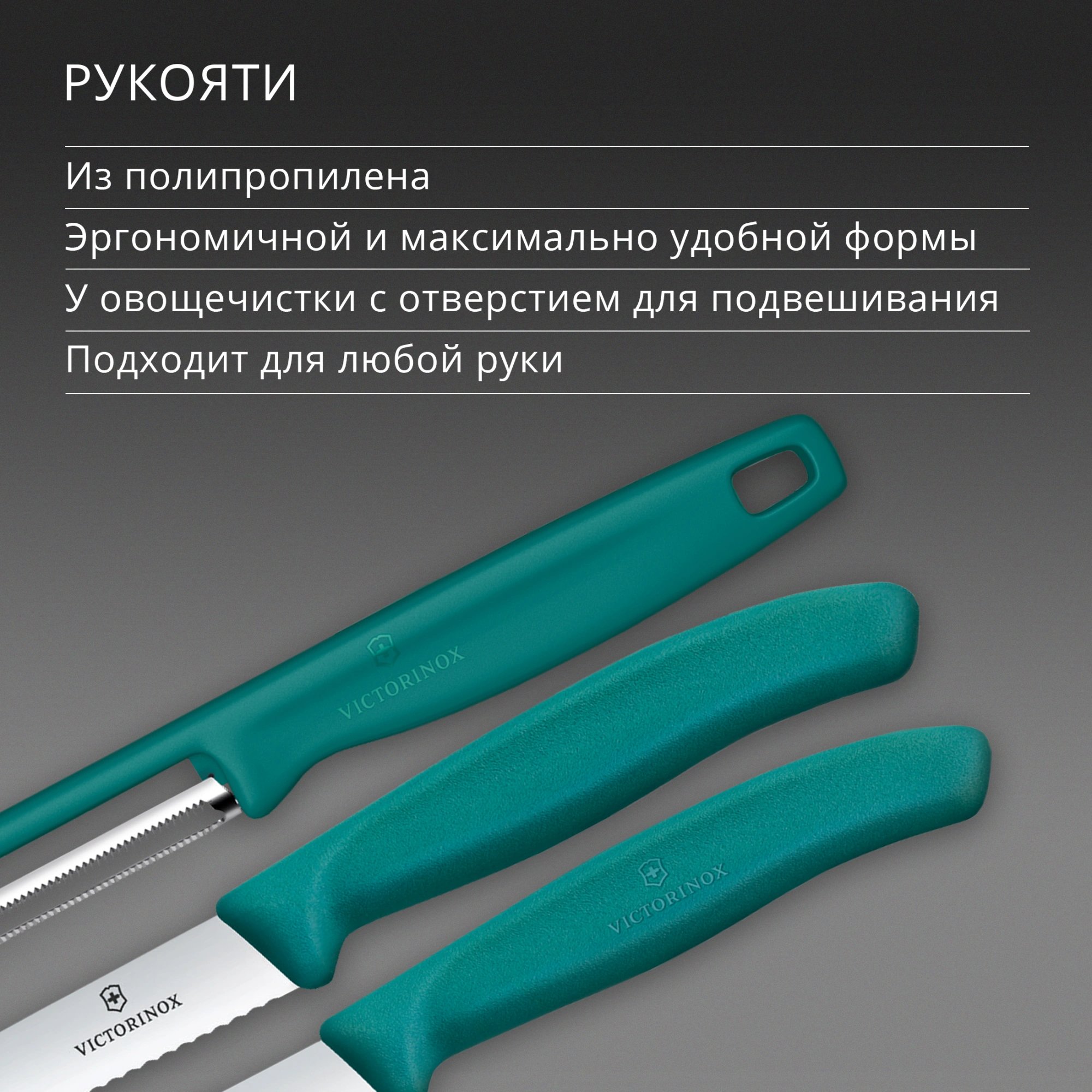 Ножи с ультраострой кромкой и эргономичными ручками, а овощечистка с острым серрейторным лезвием, которое длительное время сохраняет остроту своей кромки.