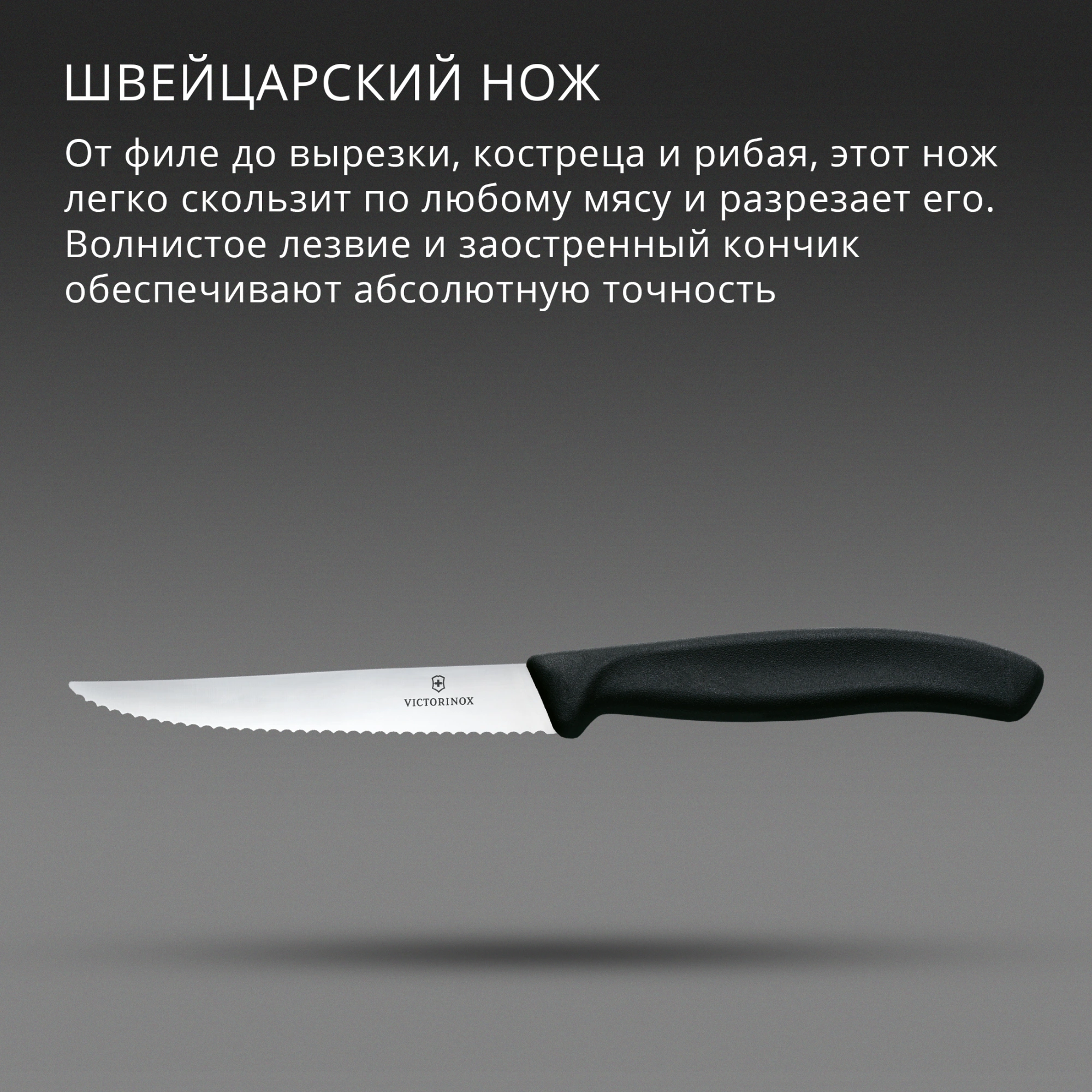 Сочетайте свой выдержанный стейк с лезвием, которое знает его мясо изнутри. Представляем швейцарский нож для стейка Swiss Classic, великолепное дополнение к вашему кулинарному арсеналу. И полный помощник на столешнице для хищников. От филе до вырезки, костреца и рибая, этот нож легко скользит по любому мясу и разрезает его. Волнистое лезвие и заостренный кончик обеспечивают полную точность. Он действительно стейковый ум.