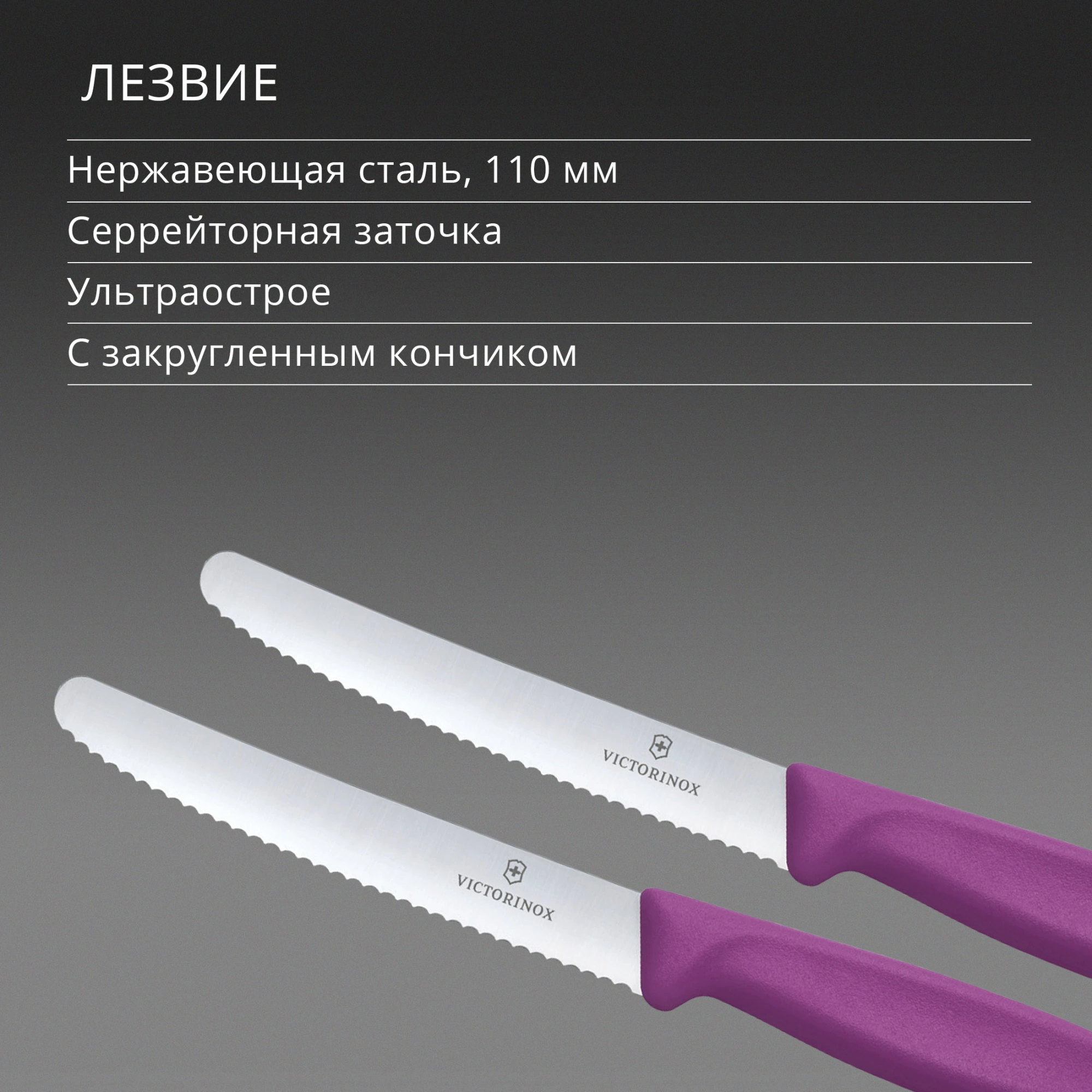 Этот набор столовых/для томатов ножей оснащен профессиональными из нержавеющей стали, острыми с волнистой кромкой лезвиями. Идеально подходит для широкого спектра точных задач по подготовке продуктов и обеспечивает идеальную нарезку. Лёгкие, эргономичные ручки обеспечивают максимальный комфорт и контроль. Изготовленные в Швейцарии и пригодные для мытья в посудомоечной машине, ножи надёжны и эффективны для ежедневного использования на кухне.