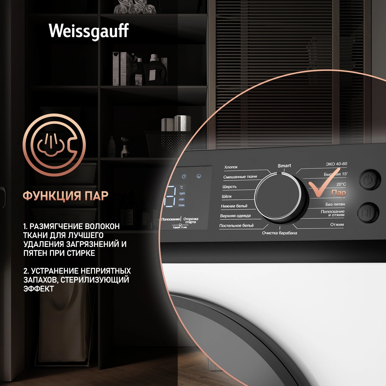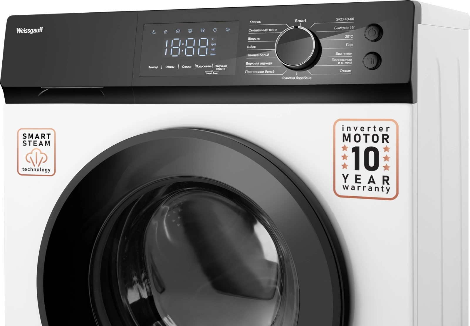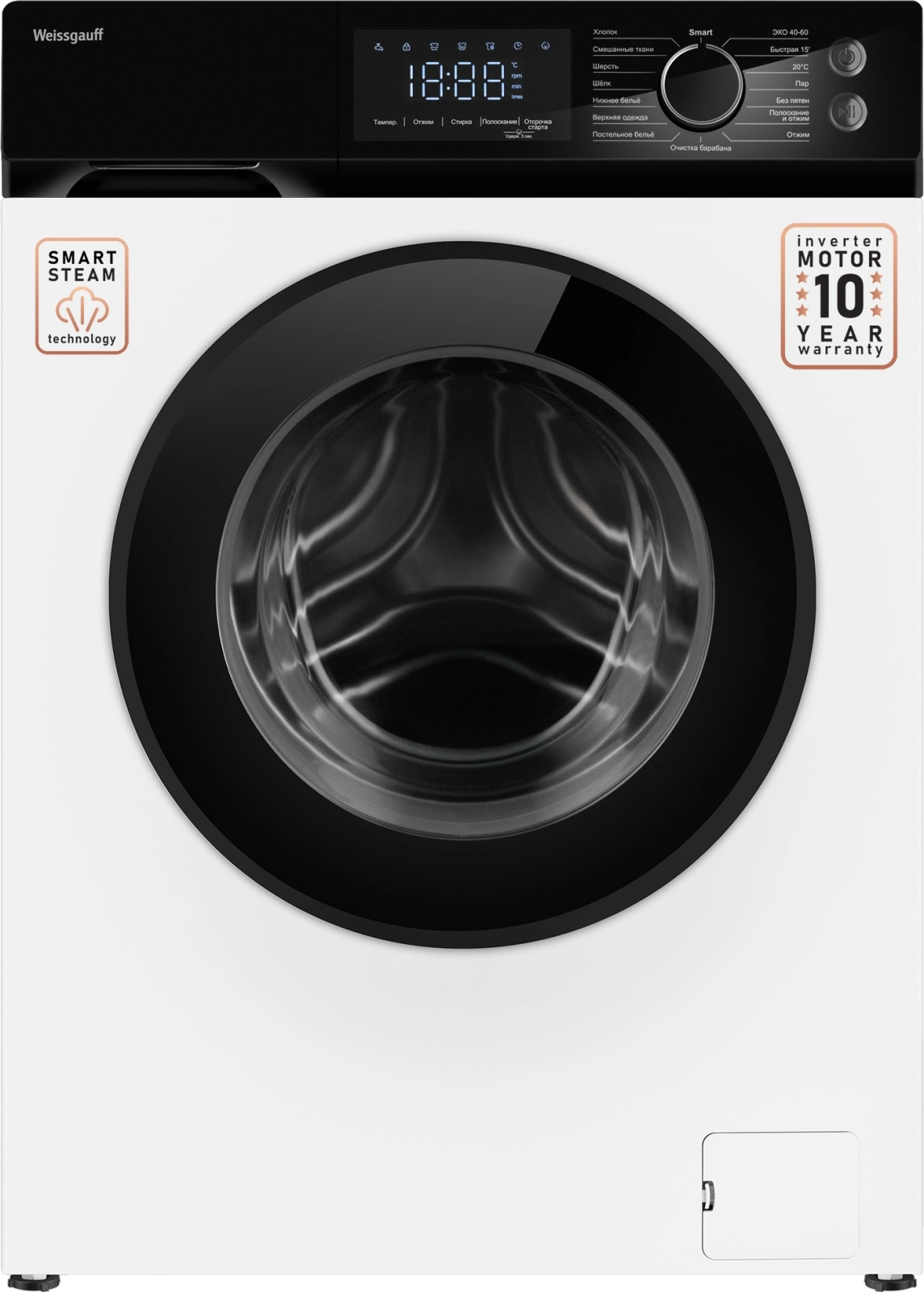 ЭКО 40-60, Быстрая 15', 20 С, Пар, Без пятен, Полоскание и отжим, Отжим, Очистка барабана, Постельное белье, Верхняя одежда, Нижнее белье, Шелк, Шерсть, Смешанные ткани, Хлопок