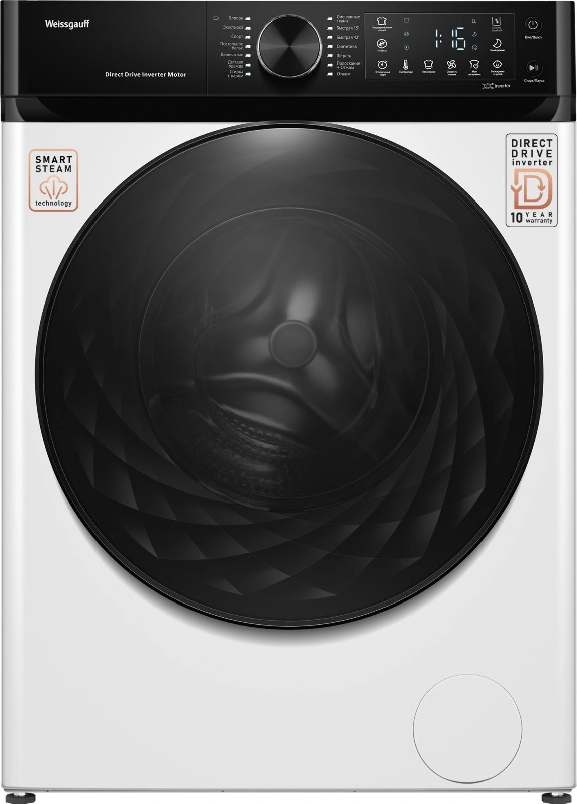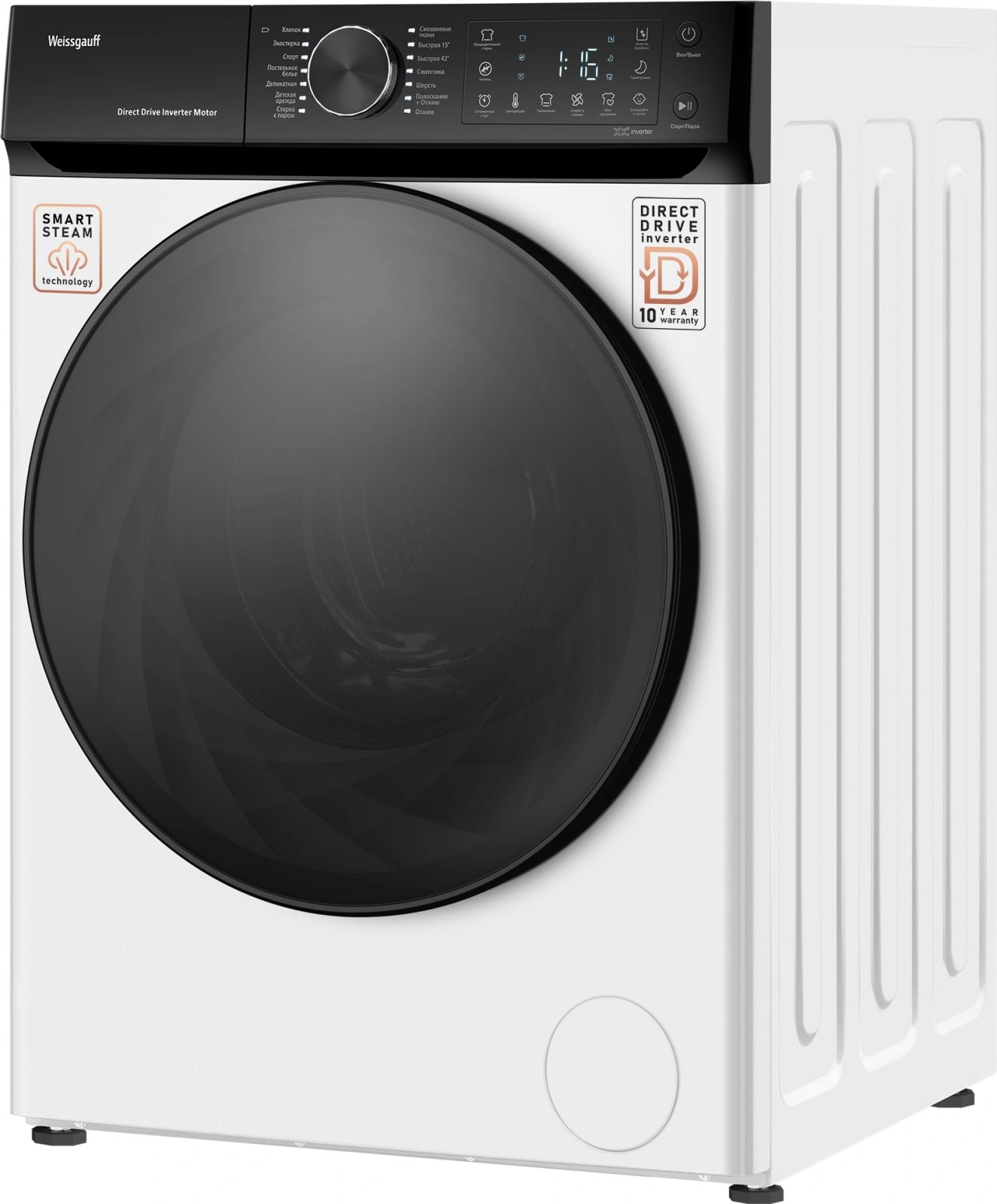 Хлопок, Быстрая 15', Быстрая 42', Экостирка, Спорт, Постельное белье, Деликатная, Детская одежда, Стирка с паром, Синтетика,Смешанные ткани, Шерсть, Полоскание+ отжим, Отжим, Очистка барабана