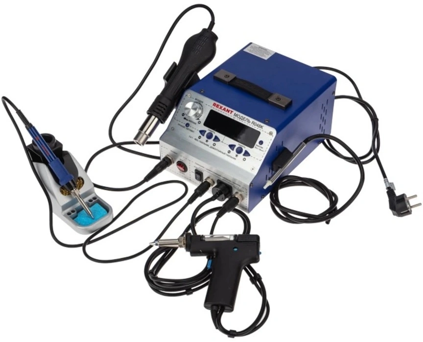 Основной блок, контроль управления, паяльник, демонтажный паяльник, держатели паяльников и фена, губка для очистки жала (в ложементе).