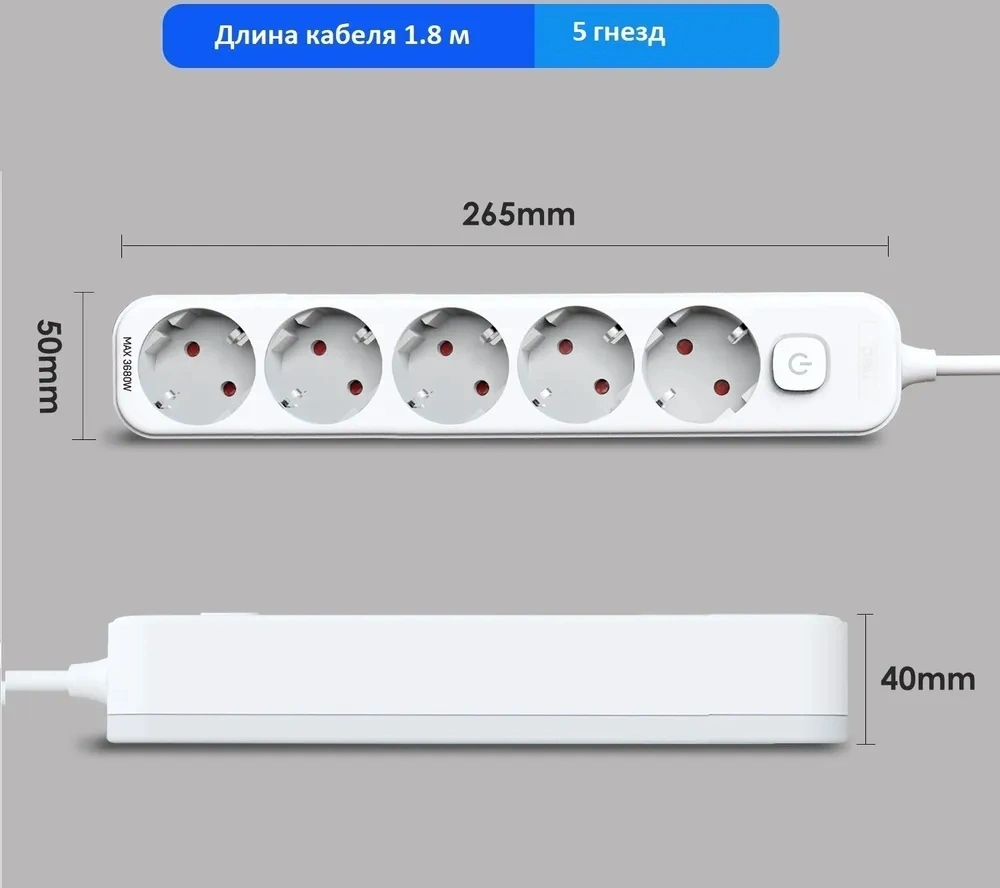 1.8м (5 розеток) белый (пакет ПЭ)