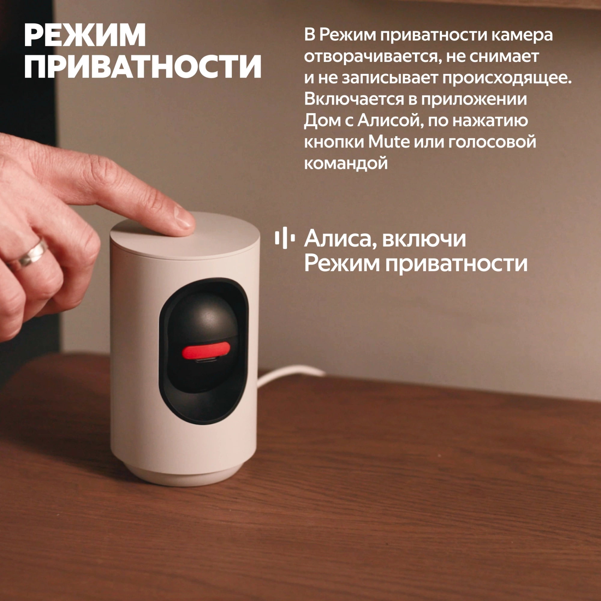 Режим приватности: в режиме приватности камера отворачивается, не снимает и не записывает происходящее. Включается в приложении Дом с Алисой, по нажатию кнопки Mute или голосовой командой.