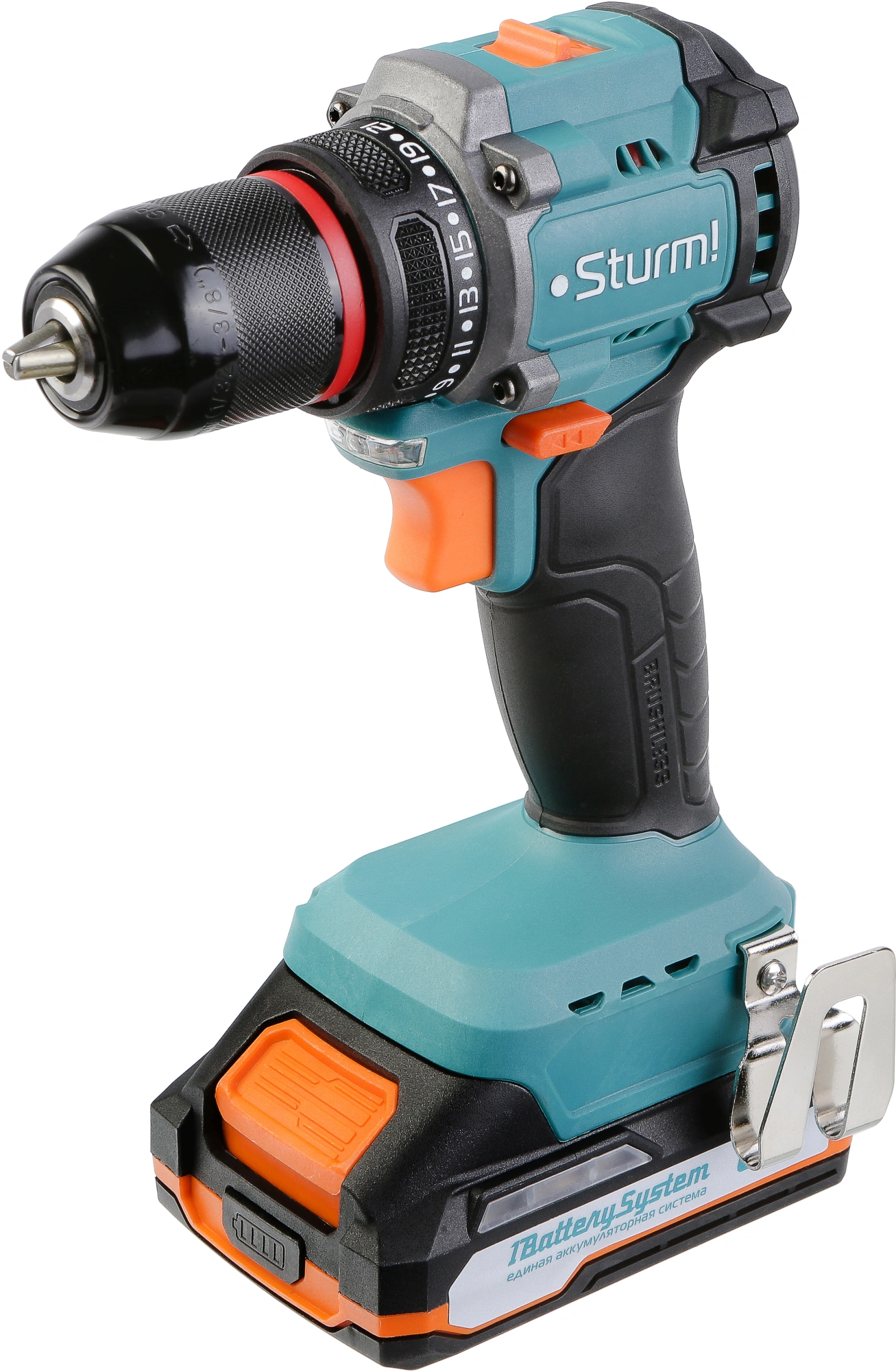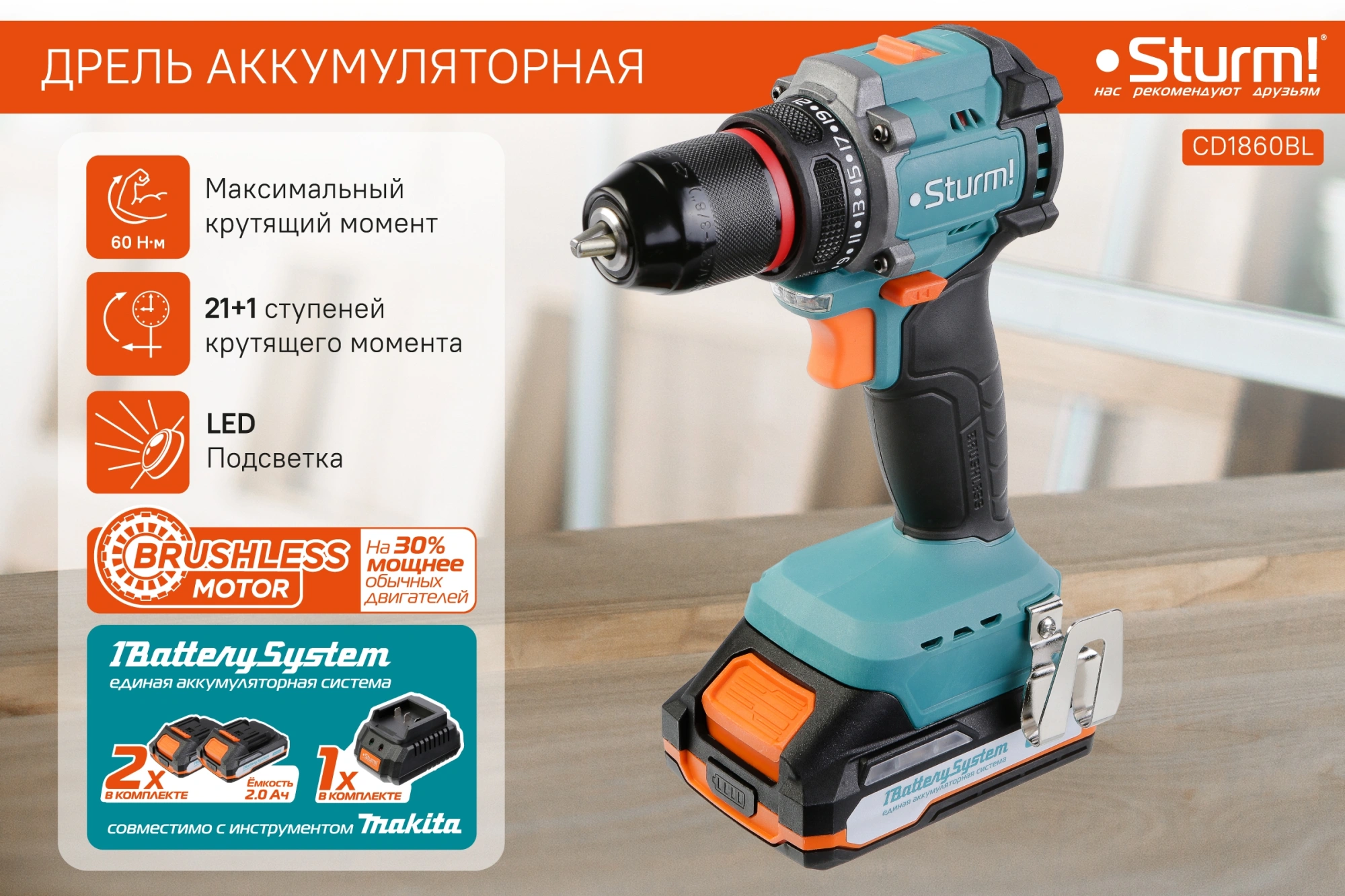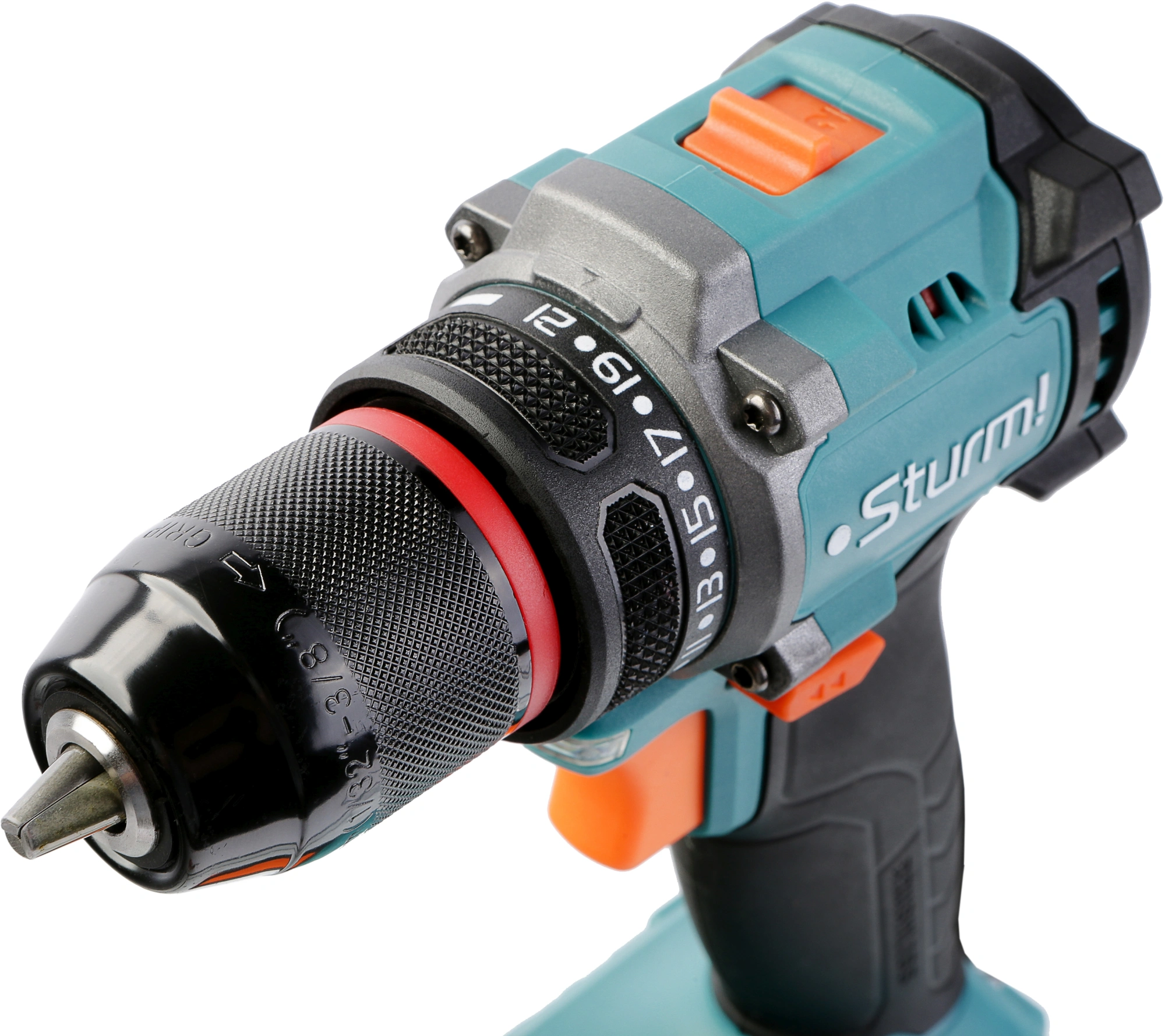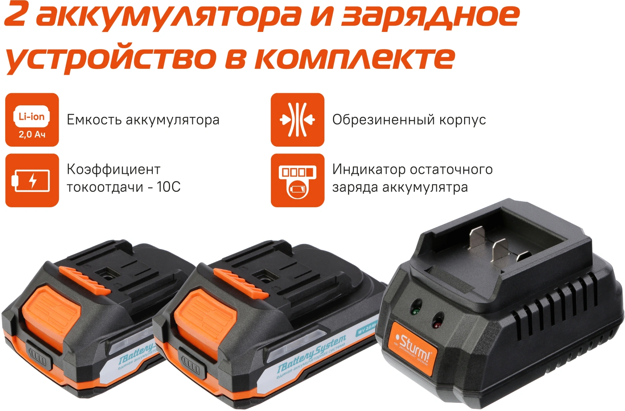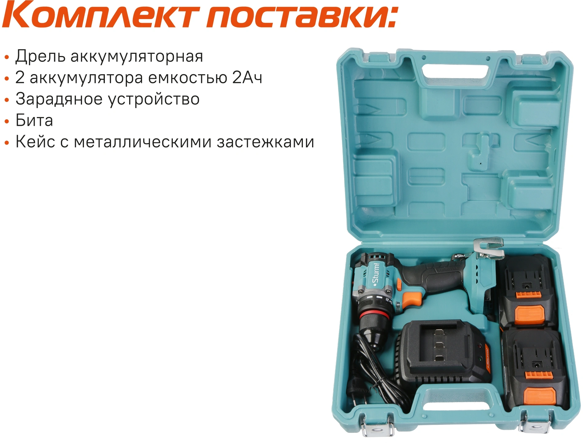 Дрель-шуруповерт, аккумуляторная батарея (2 шт.), зарядное устройство, двусторонняя бита, инструкция по эксплуатации, инструкция по безопасности, кейс.