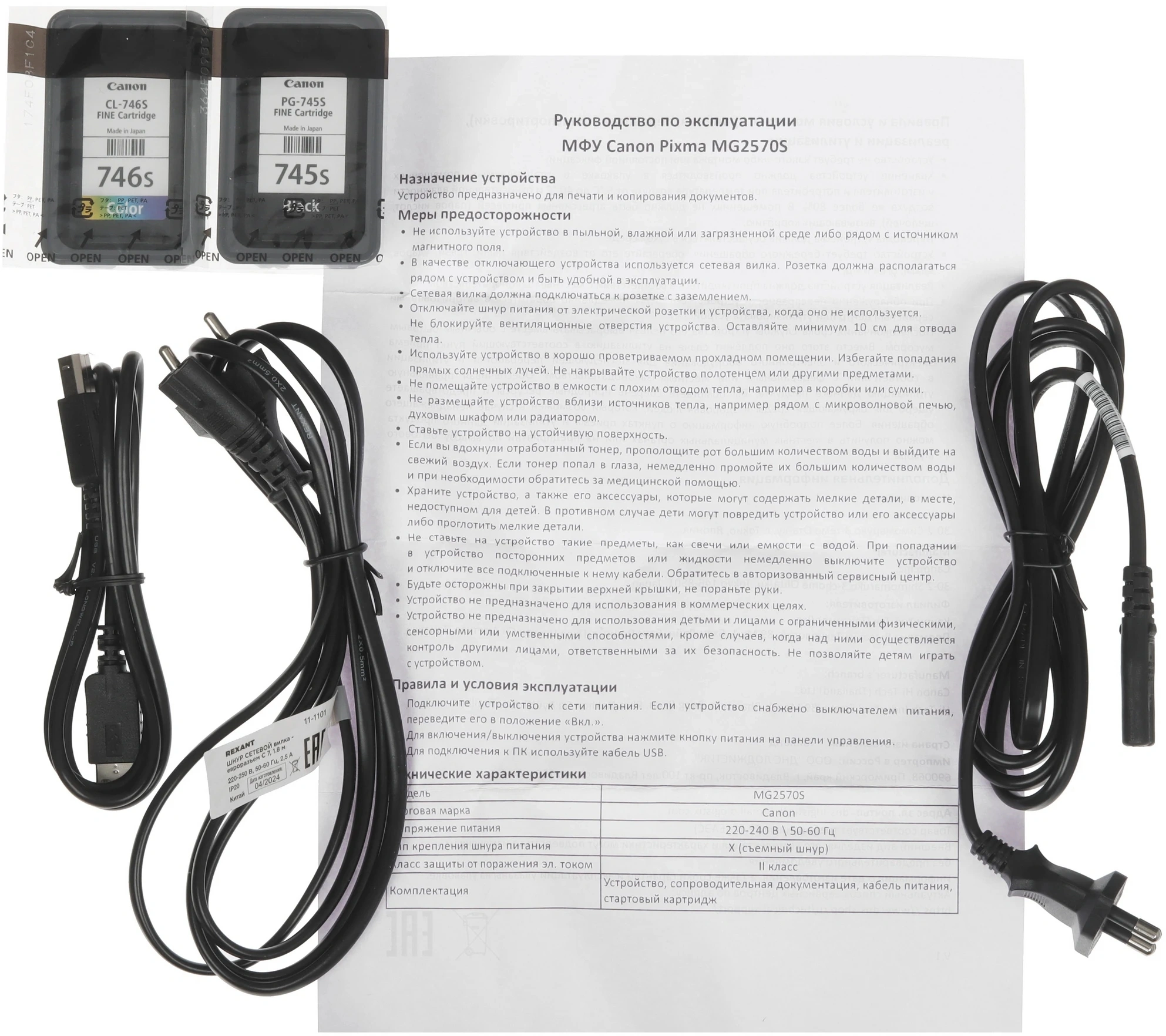 МФУ, кабель питания, USB кабель, стартовые картриджи, руководство.