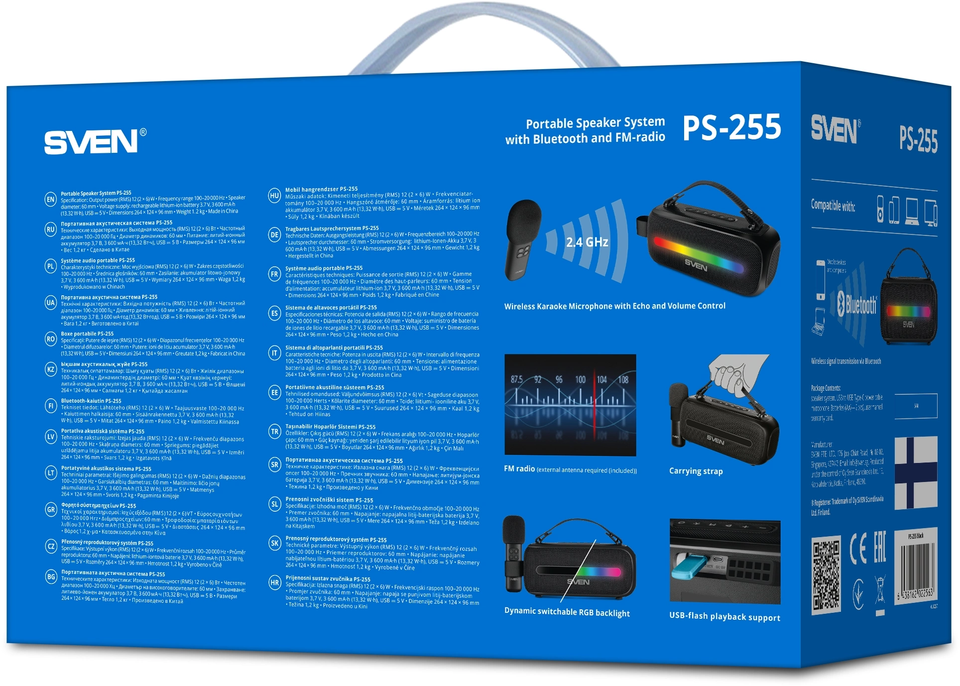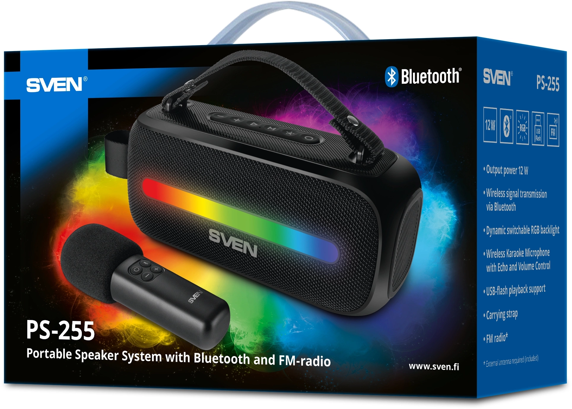 SVEN PS-255 оборудована плеером, воспроизводящим файлы с USB-накопителей. Помещаем «флешку» в предназначенный для нее разъем. Если же и коллекцию любимых треков взять с собой не удалось, можно послушать новинки хит-парадов с помощью FM-радио,для работы которого понадобится идущая в комплекте антенна