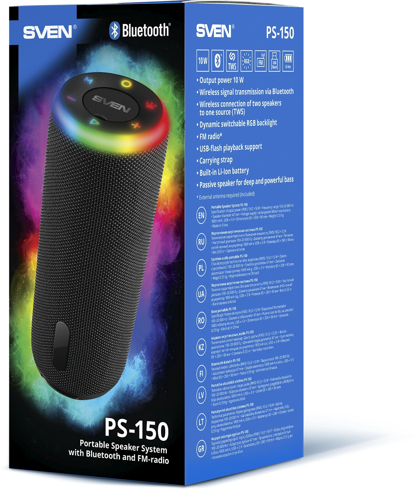Внешние источники звука подключаются к портативной акустике посредством Bluetooth, причем к одному гаджету можно подключить сразу две колонки для достижения большей громкости, получения стереоэффекта и еще более эффектной подсветки. Совместимость в режиме TWS- SVEN PS-150