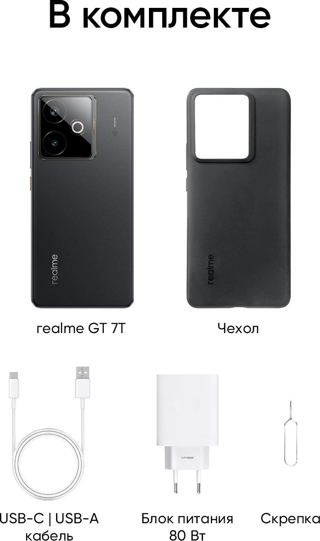Смартфон, Зарядное устройство, Кабель USB Type-C, Скрепка для извлечения SIM, Краткое руководство пользователя, Гарантийный талон, Защитный чехол