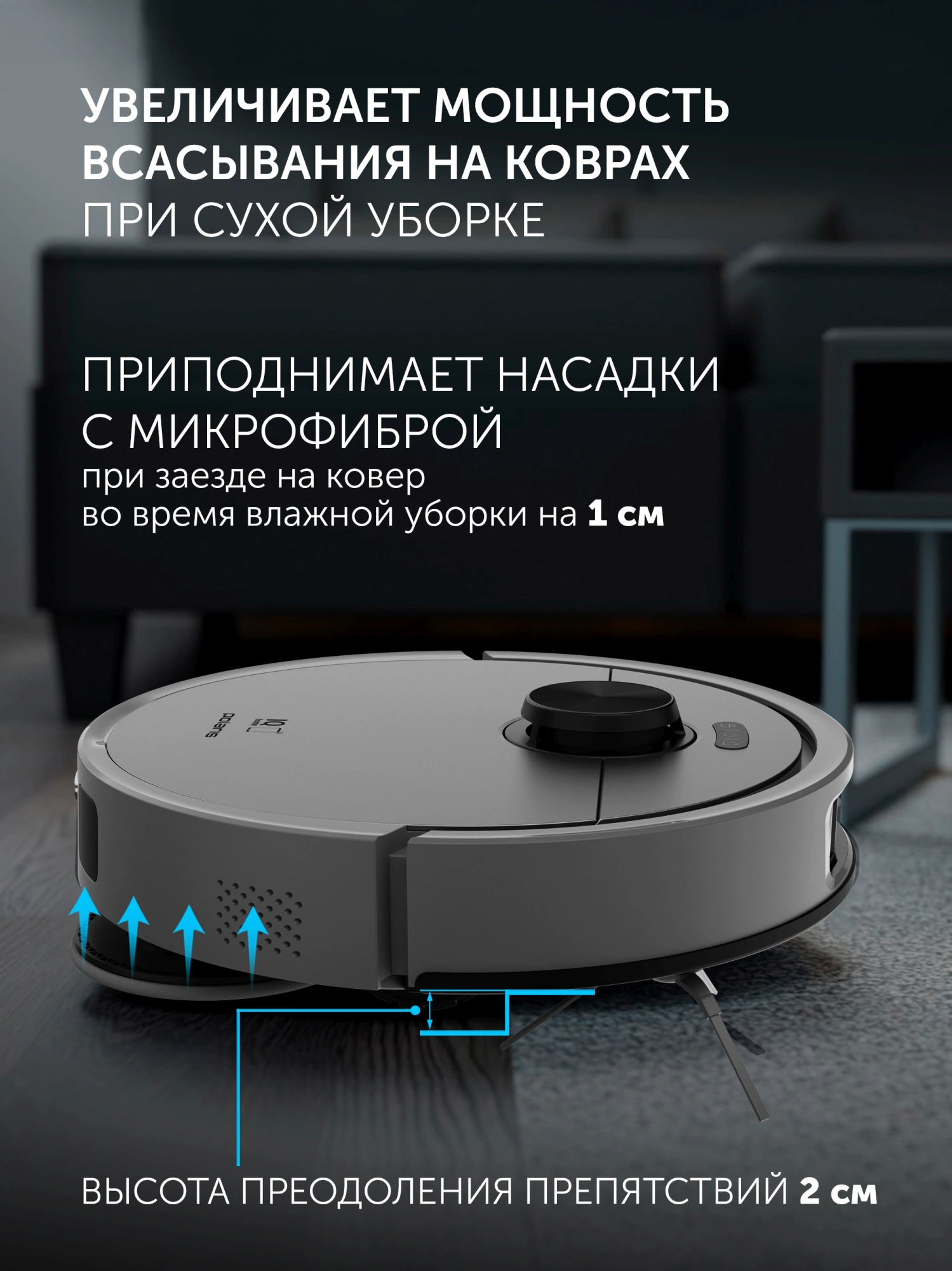 автоматическое увеличение мощности на ковре, легко очищаемый пылесборник, подсветка зоны уборки, прорезиненные колеса