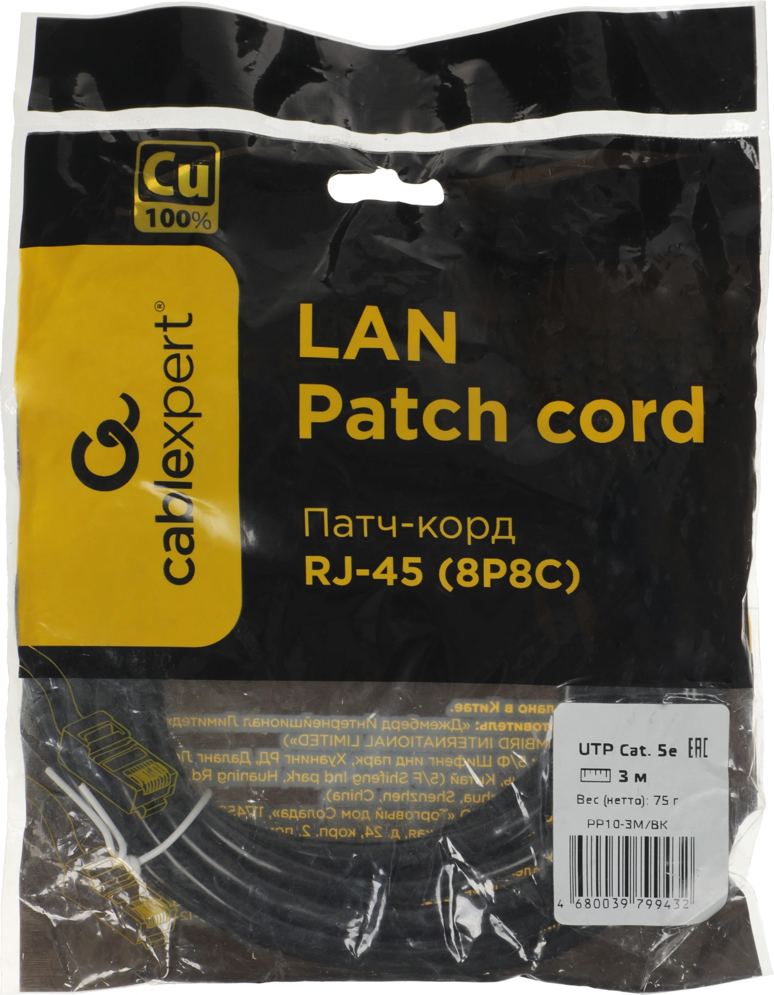 1Гбит/с UTP 4 пары cat.5E 0.02мм Cu molded 3м черн...