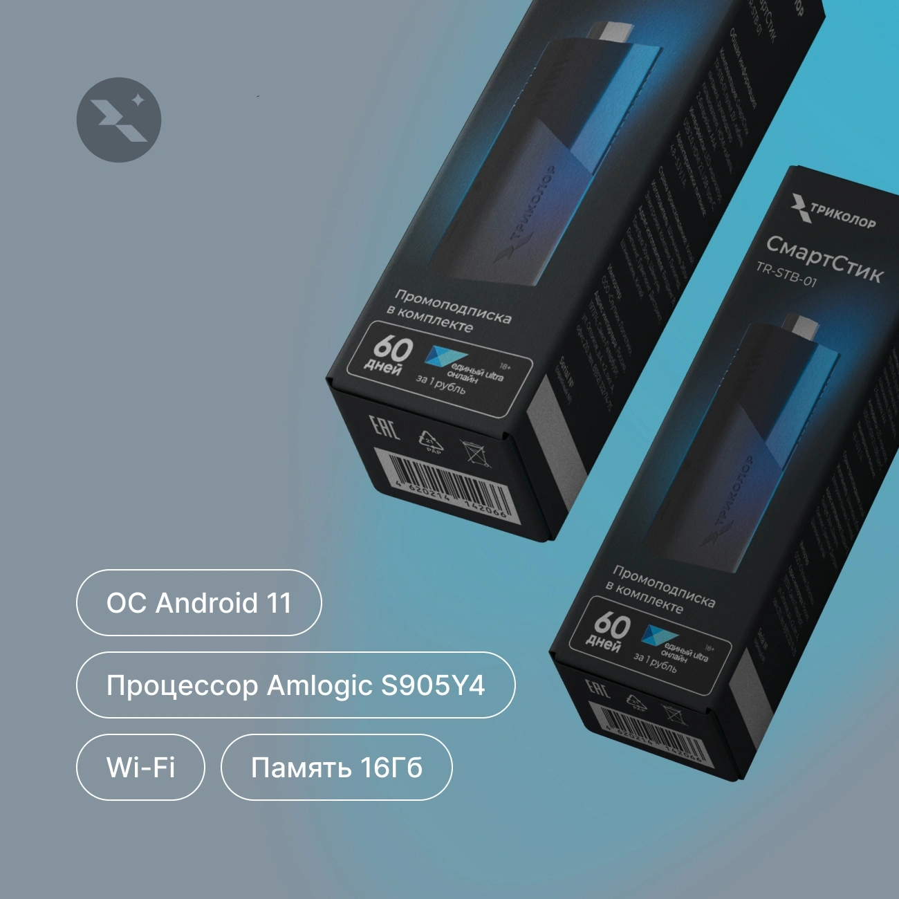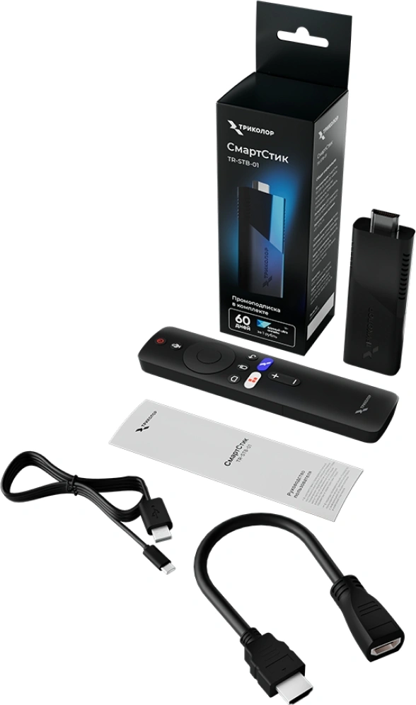 Триколор СмартСтик, Пульт дистанционного управления, 2x батарейки ААА, Руководство пользователя, HDMI-кабель, Кабель питания (USB – USB type C), Вкладыш с промо-подпиской, Упаковка в новом фирменном дизайне «Триколор»