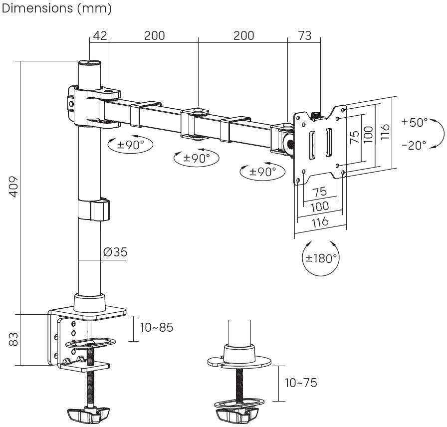 Кронштейн подходит для мониторов 17-49” VESA 75х75, 100х100 и выдерживает нагрузку до 20 кг. Доступны для варианта крепления к столу.