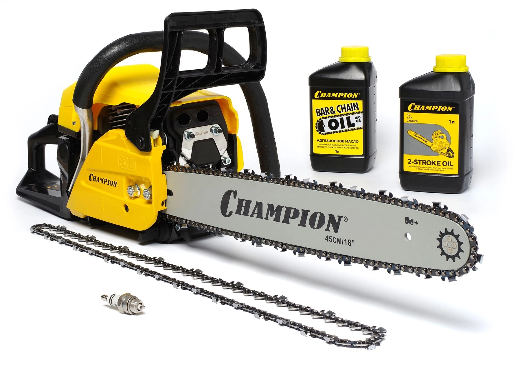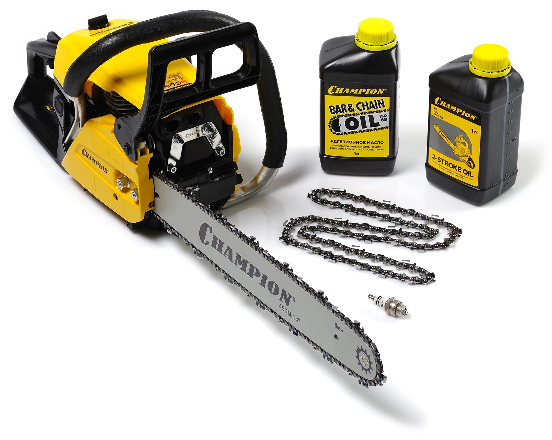 Бензопила; руководство по эксплуатации; шина; цепь пильная; чехол для шины; отвертка; ключ свечной; ключ Г-образный шестигранный 4мм; ключ Г-образный шестигранный 5мм; емкость для приготовления топливной смеси; упор зубчатый; винт крепления зубчатого упора 2 шт; гайка крышки шины 2 шт.