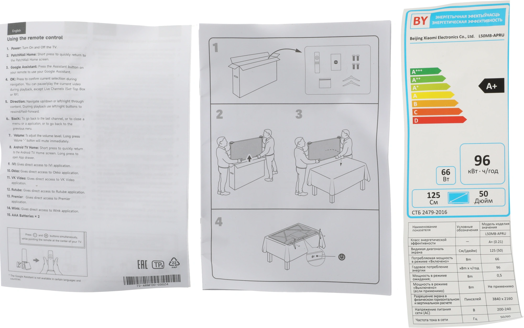 винты, документация, кабель питания, настольная подставка, пульт ДУ
