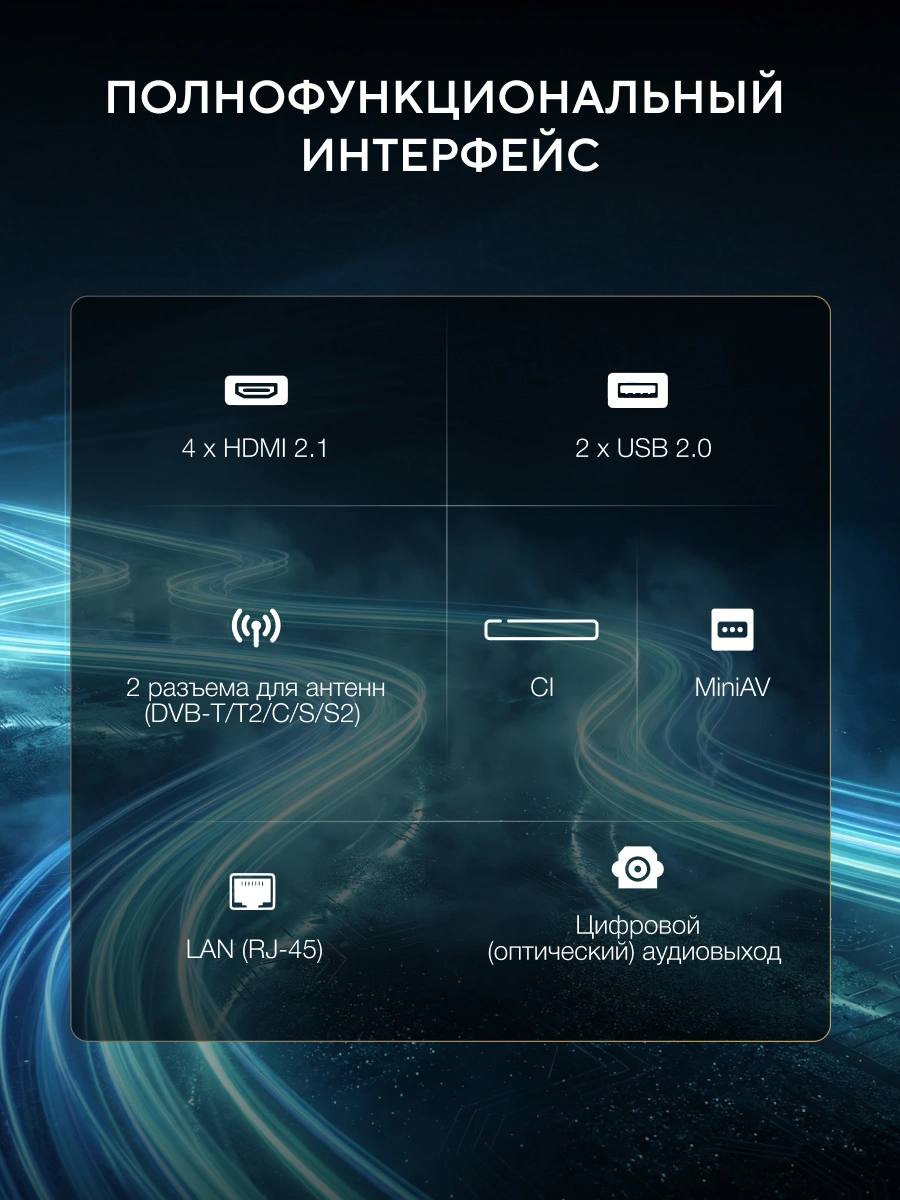 CI+/PCMCIA, HDMI, RJ-45 (Ethernet), S/PDIF (оптический), USB Type-A