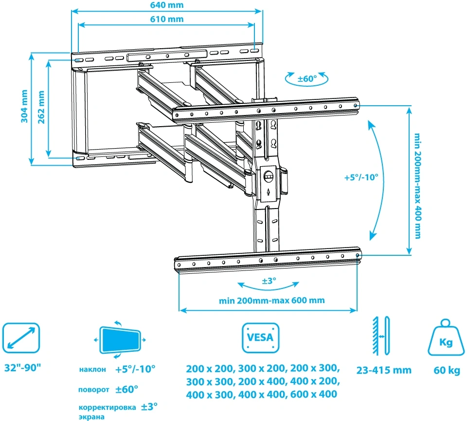 черный 32"-90" макс.60кг настенный поворот и накло...