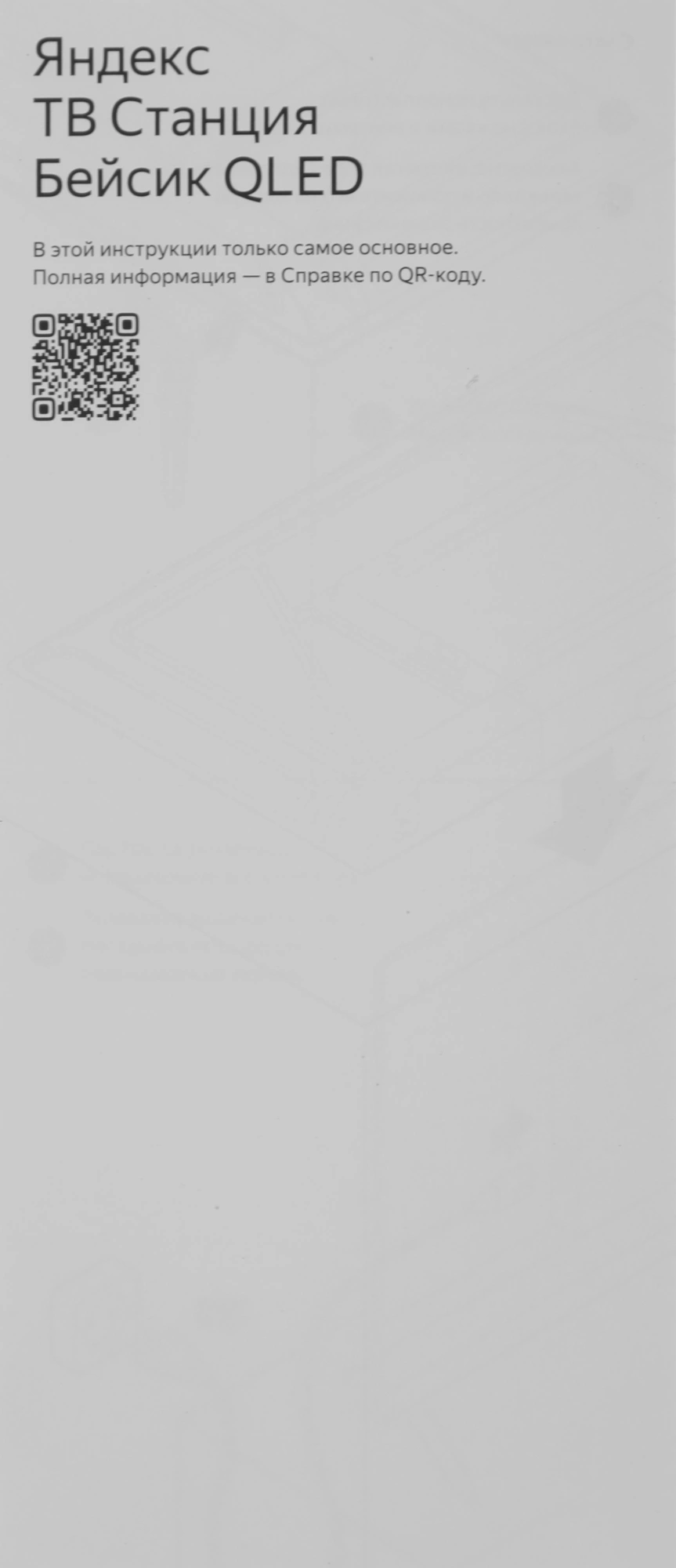 ТВ Станция Бейсик QLED, Две ножки и комплект винтов, Пульт и 2 батарейки ААА (внутри), Кабель питания, Краткое руководство пользователя