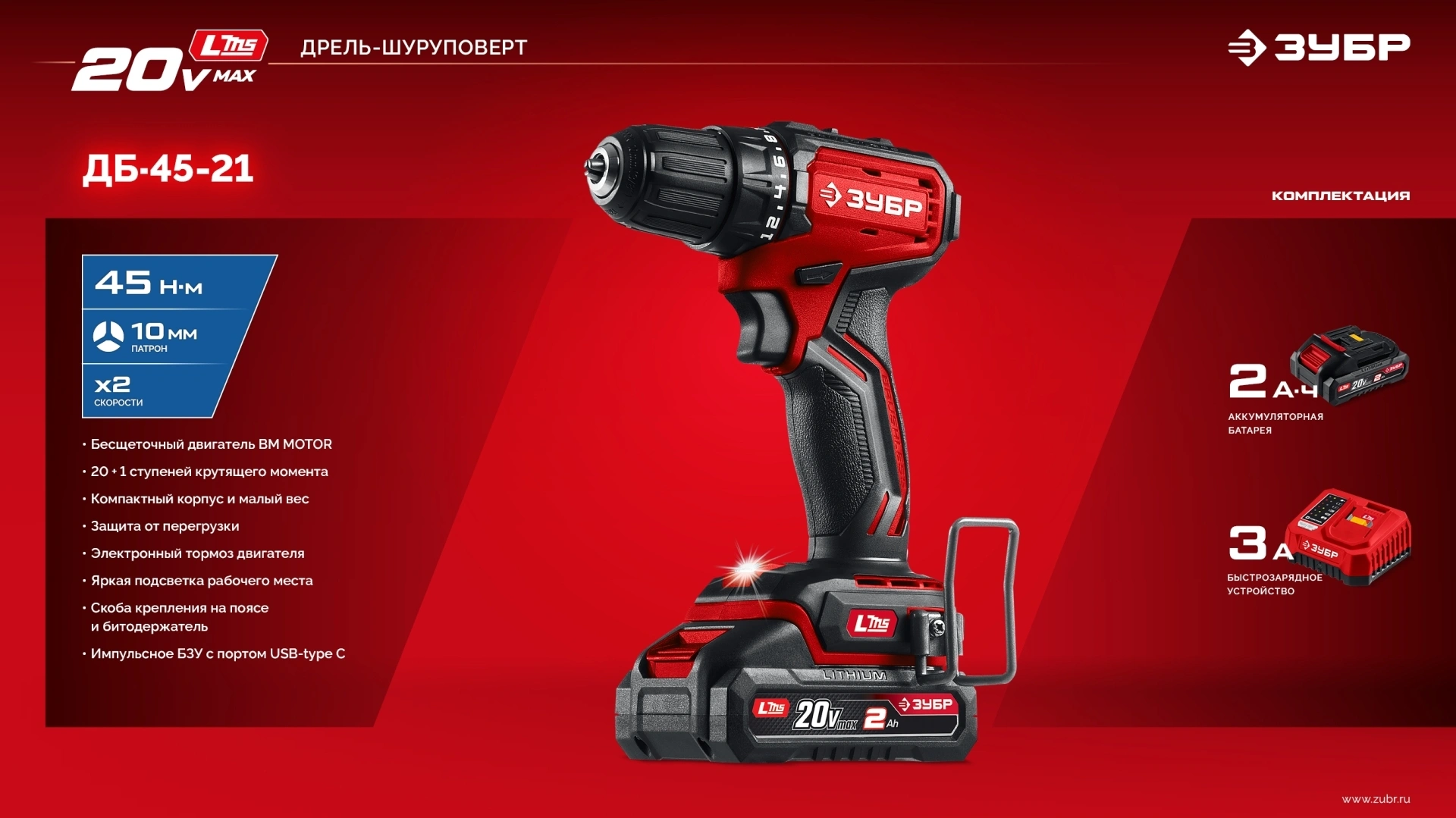 Дрель-шуруповерт, аккумулятор, зарядное устройство, бита, скоба крепления, руководство по эксплуатации.
