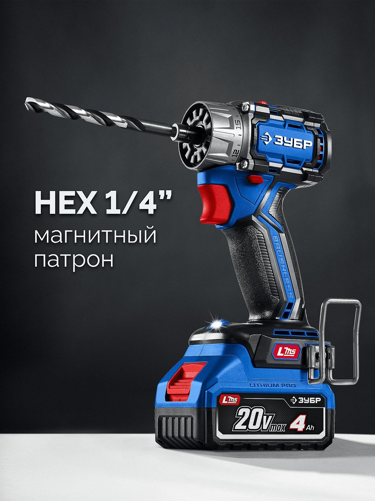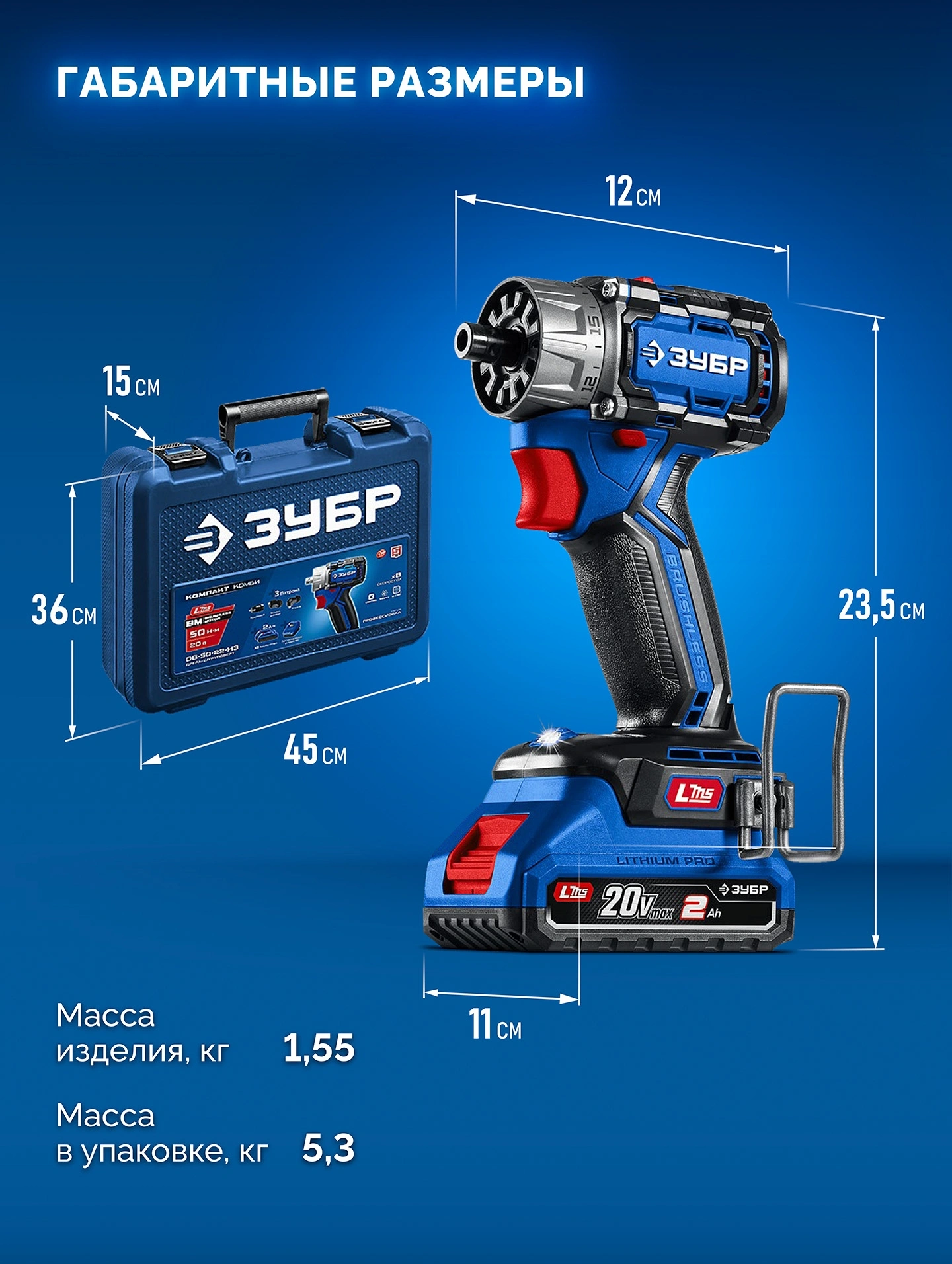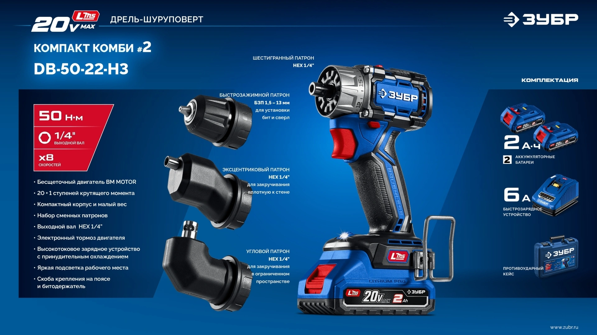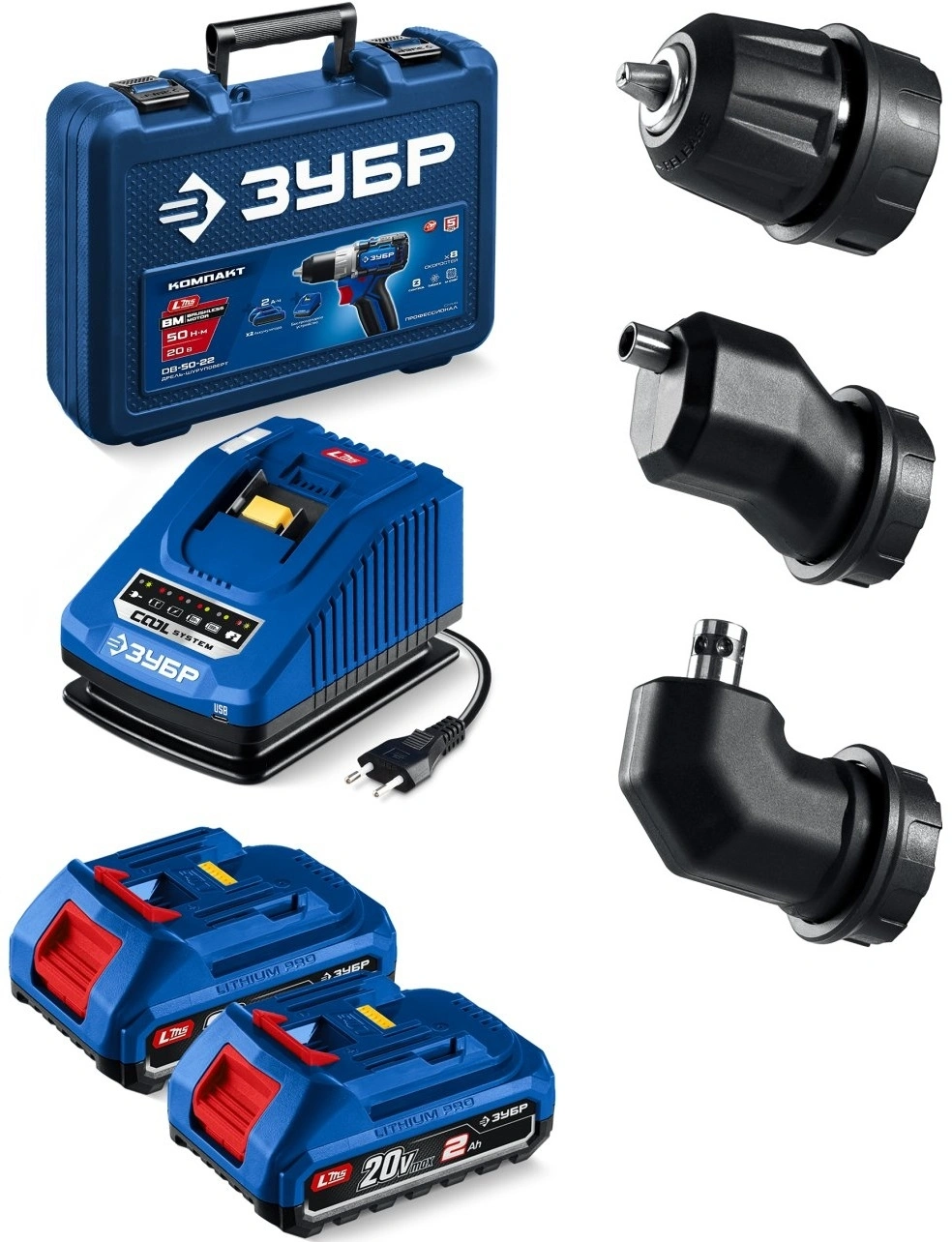 Дрель-шуруповерт, патрон кулачковый, патрон эксцентриковый, патрон угловой, аккумулятор - 2 шт., зарядное устройство, скоба поясная, бита (50 мм, PH, PZ), битодержатель, кейс, руководство по эксплуатации.