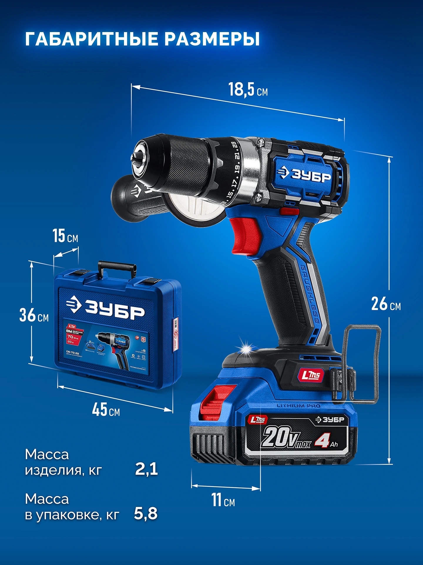 Дрель-шуруповерт, аккумулятор - 2 шт., зарядное устройство, рукоятка дополнительная, скоба поясная, бита 50 мм. PH, PZ; битодержатель, кейс, руководство по эксплуатации.