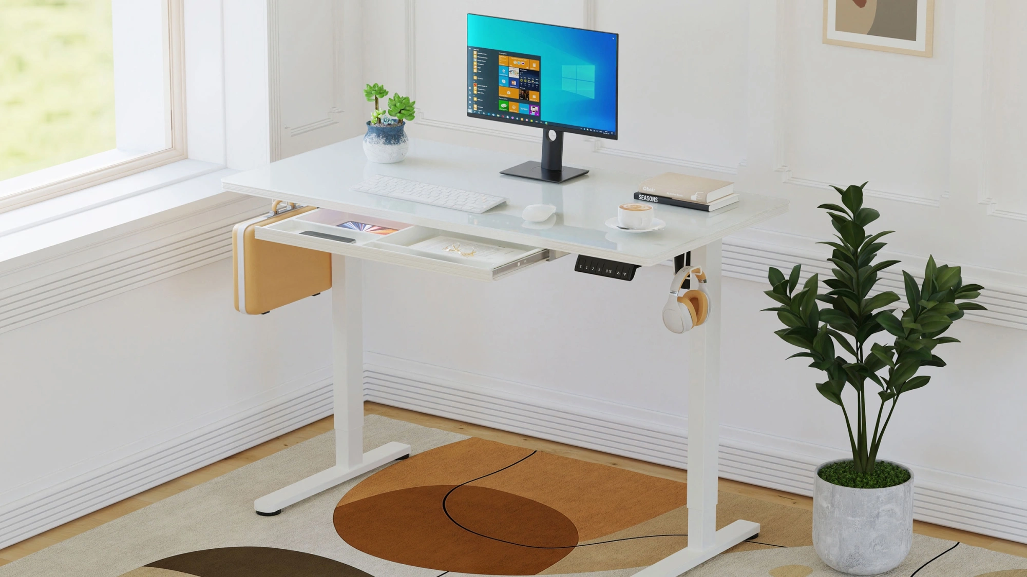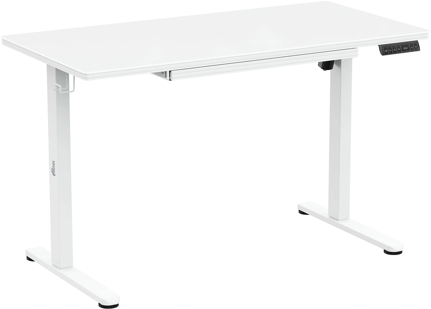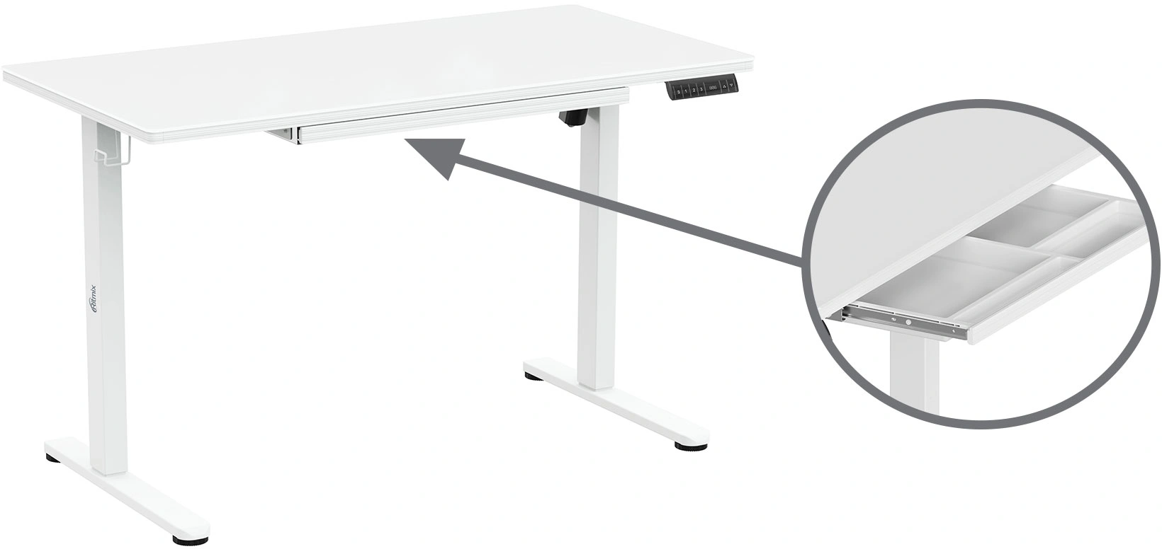 Стол с регулируемой высотой и памятью на 3 положения. Цельная столешница из закаленного стекла 120*60 см, выдвижной ящик, Type-C выход зарядки 2А. Электропривод, плавная регулировка, автостоп – защита от столкновений. Нагрузка до 50 кг