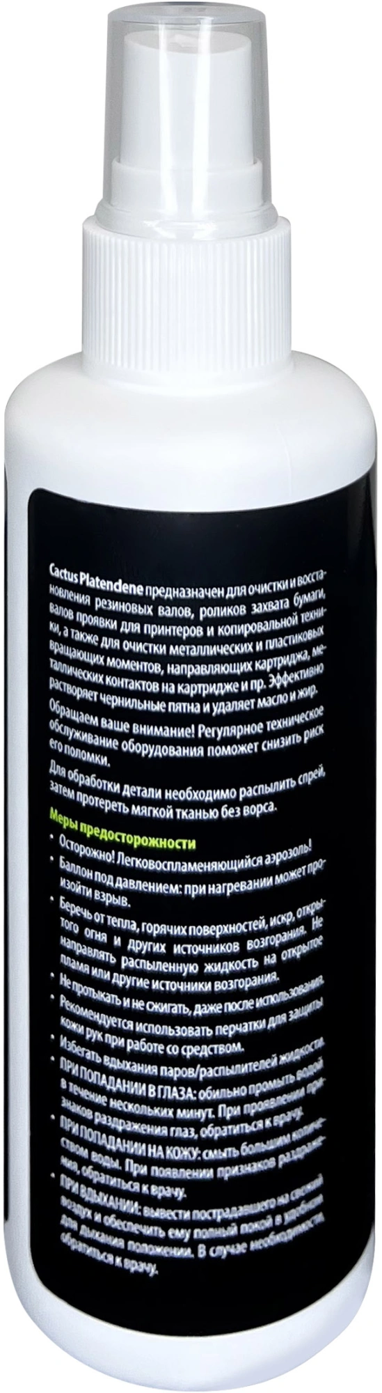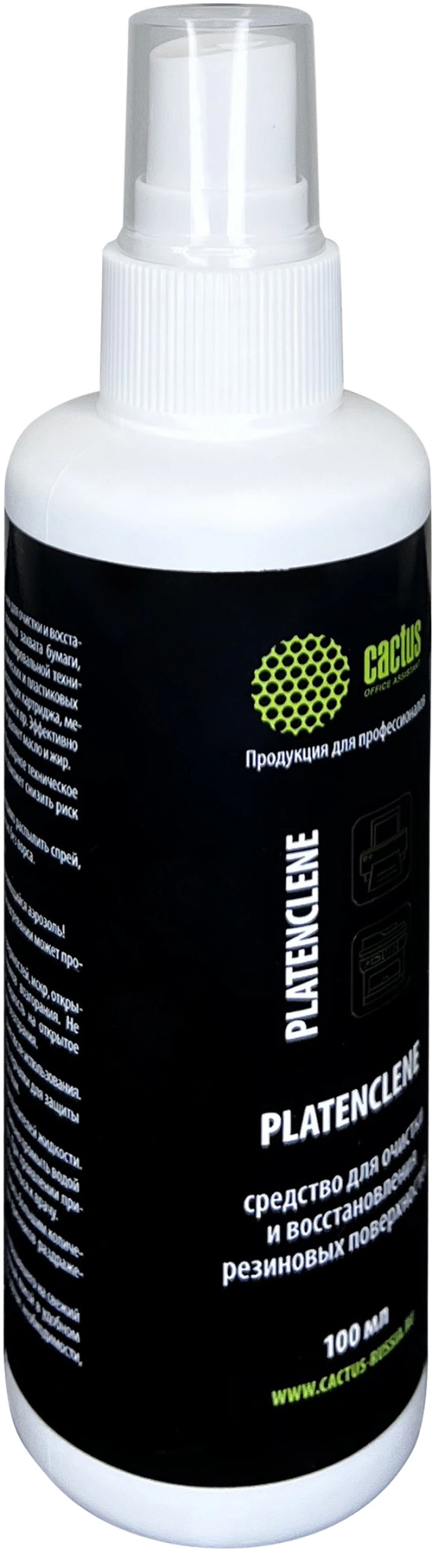 Cactus Platenclene разработан для очистки и восстановления резиновых поверхностей, валов проявки для принтеров и копировальной техники, роликов захвата бумаги, а также для очистки металлических и пластиковых вращающих моментов, направляющих картриджа, металлических контактов на картридже и пр. Очиститель эффективно растворяет тонерные и чернильные пятна, удаляет масло и жир.