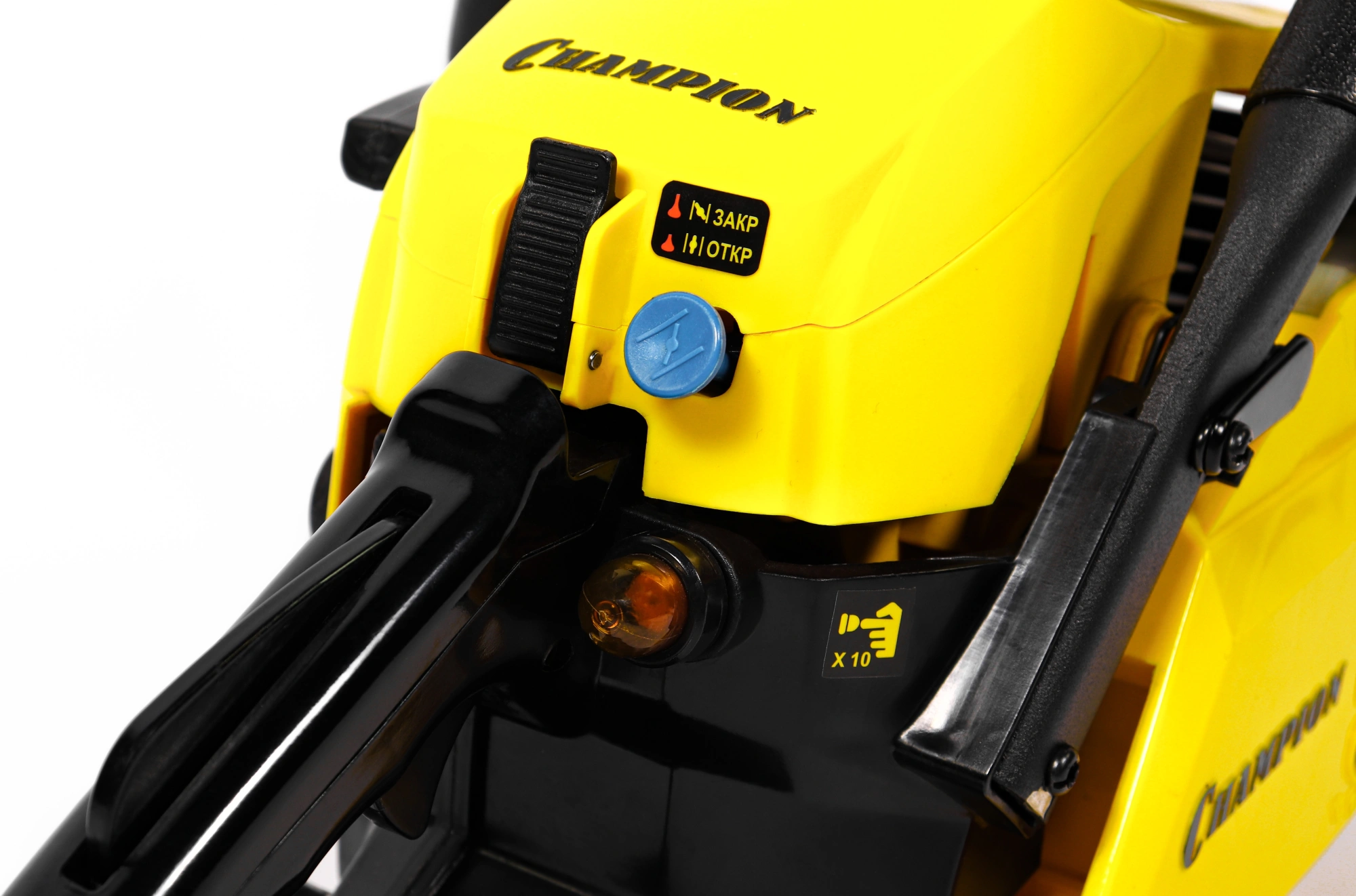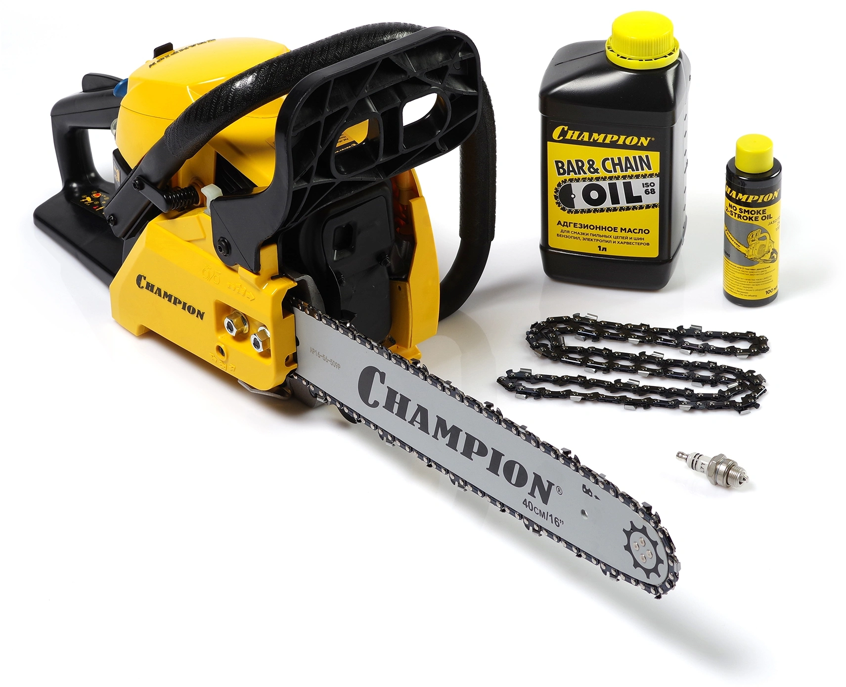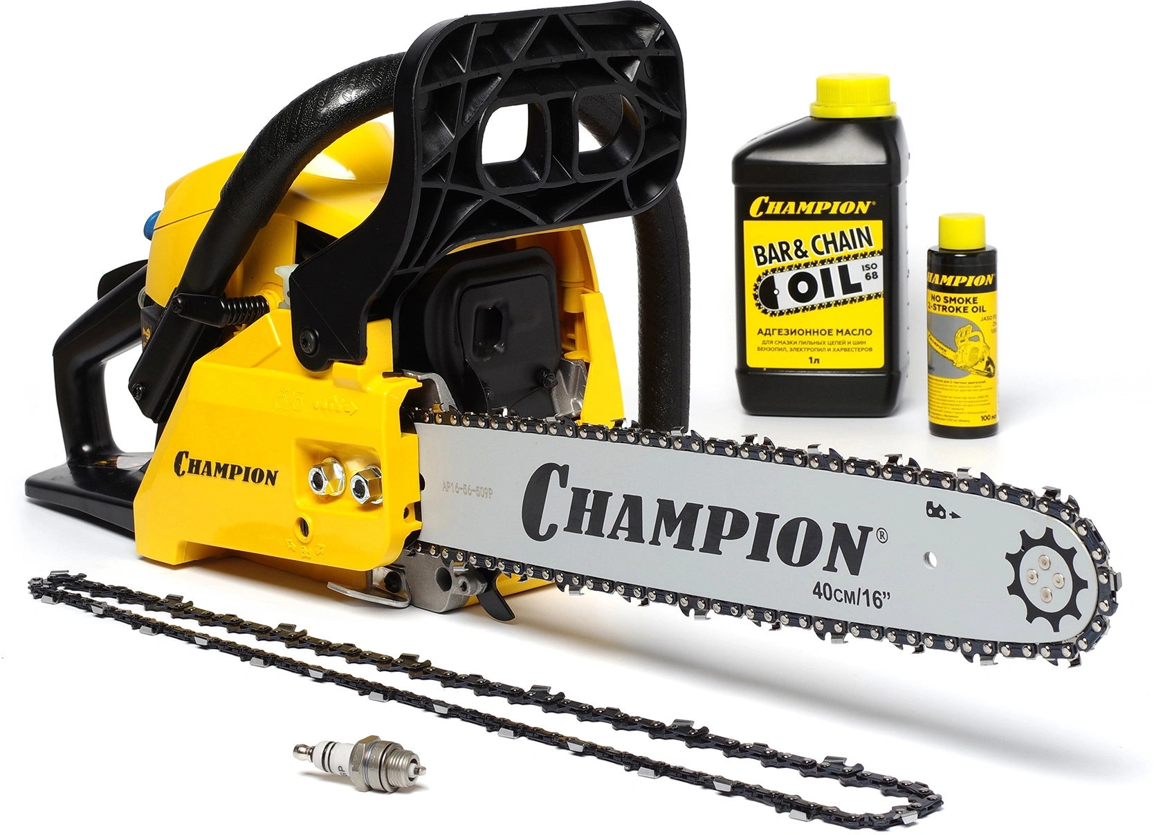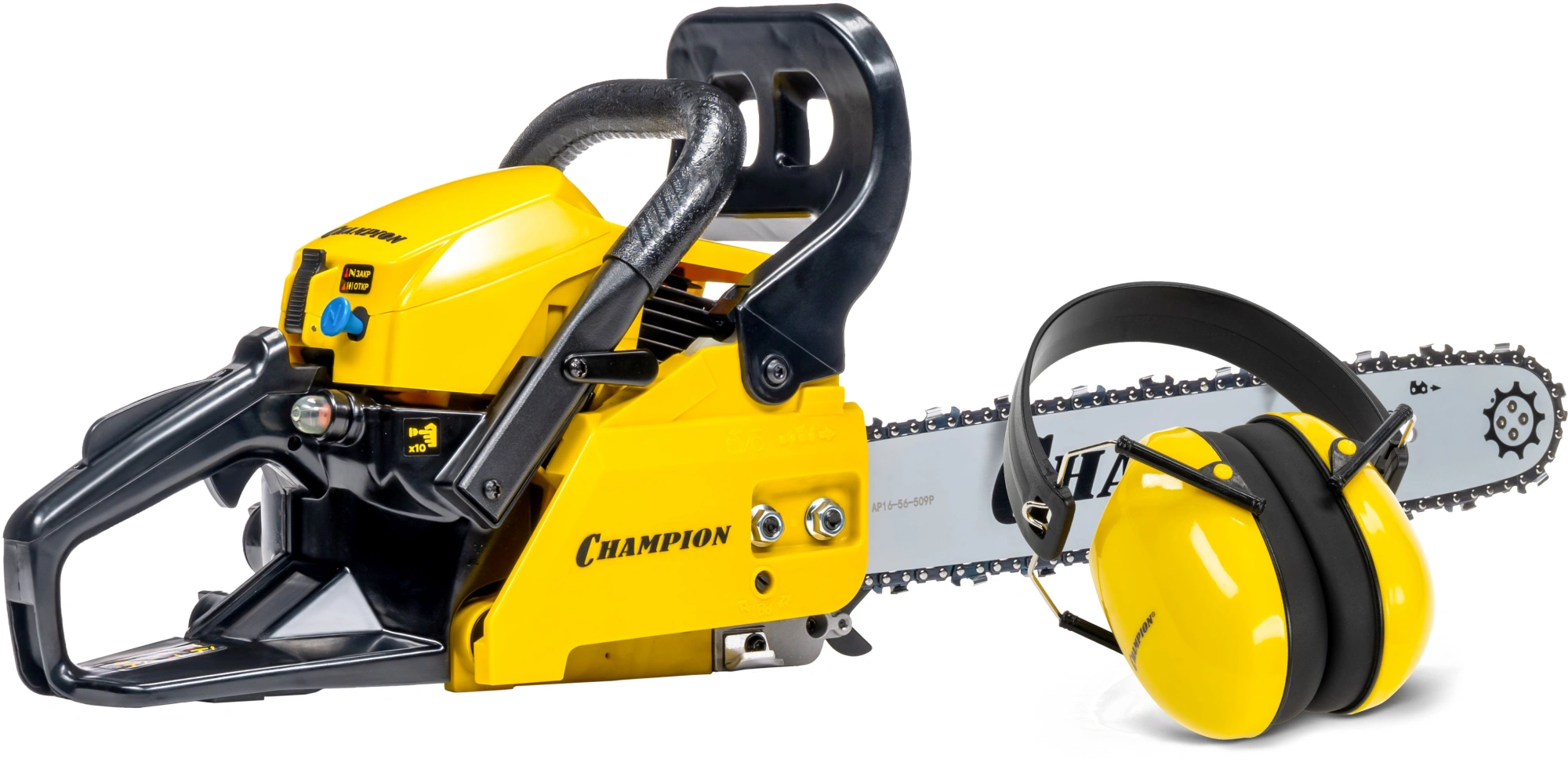 Легкая бензопила с двигателем 1,8 кВт (2,45 л.с.) и шиной 40 см, подходит для обрезки веток и заготовки дров. Вес без шины и цепи — 4,7 кг. В комплекте — цепь, свеча зажигания, смазка и присадка для топлива. В подарок идут защитные наушники Champion C1002. Легкий старт, автоматическая смазка цепи.