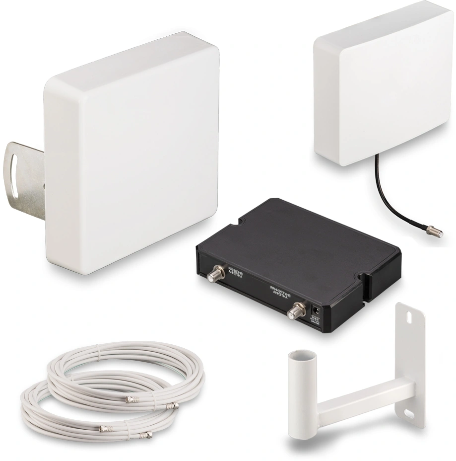 Комплект LTE1800/2600, GSM1800, UMTS2100. Покрытие до 100 м2. Подходит для всех мобильных операторов РФ (МТС, Билайн, Мегафон, Tele2 и т.д.). Комплектуется внешней широкополосной антенной KP15-750/2900 усилением 15 дБ и внутренней настенной антенной KP10-900/2700W усилением 10 дБ.