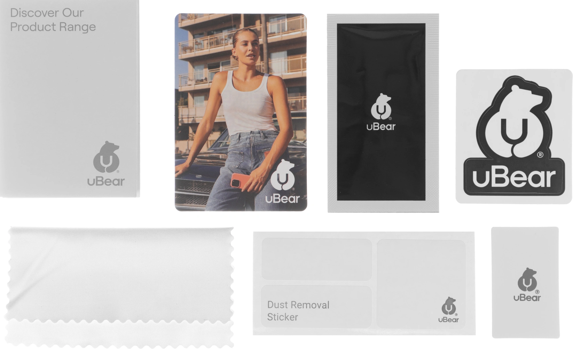 Защитное стекло, микрофибра, стикеры для удаления пыли, лопаточка для разглаживания.