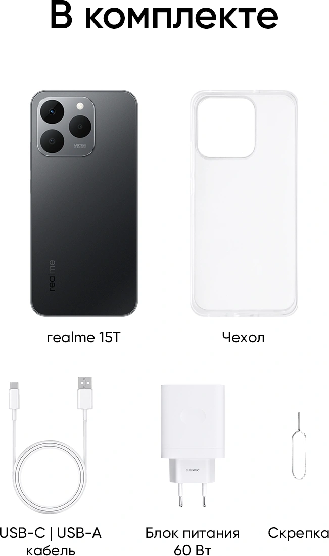 realme 15T 5G, Кабель USB Type-C, Адаптер питания, Защитный чехол, Игла для SIM-карты, Краткое руководство, Руководство по безопасности