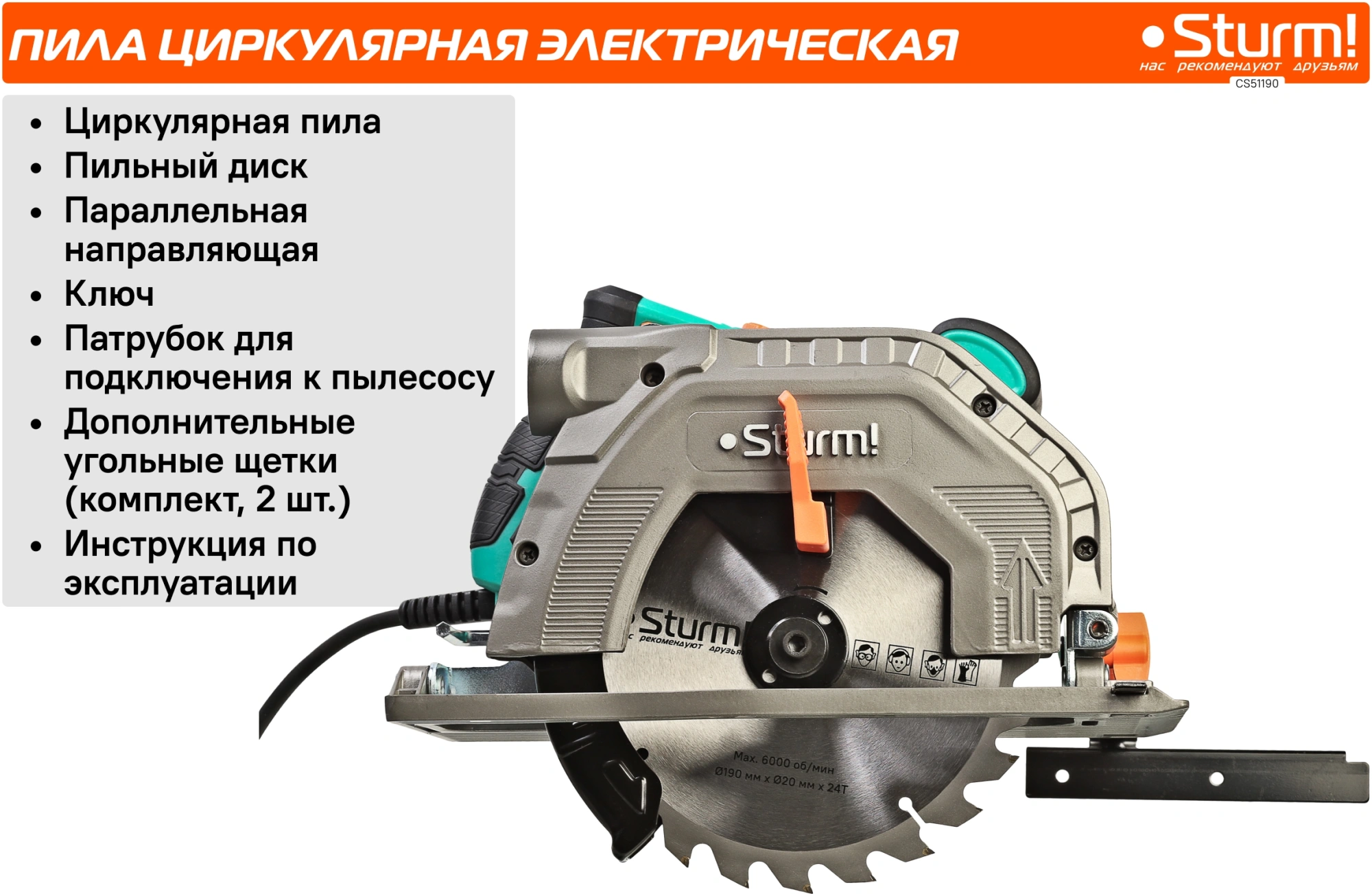 Пильный диск, параллельная направляющая, гаечный ключ, патрубок для подключения к пылесосу, дополнительные угольные щетки (комплект, 2 шт.), инструкция по эксплуатации.