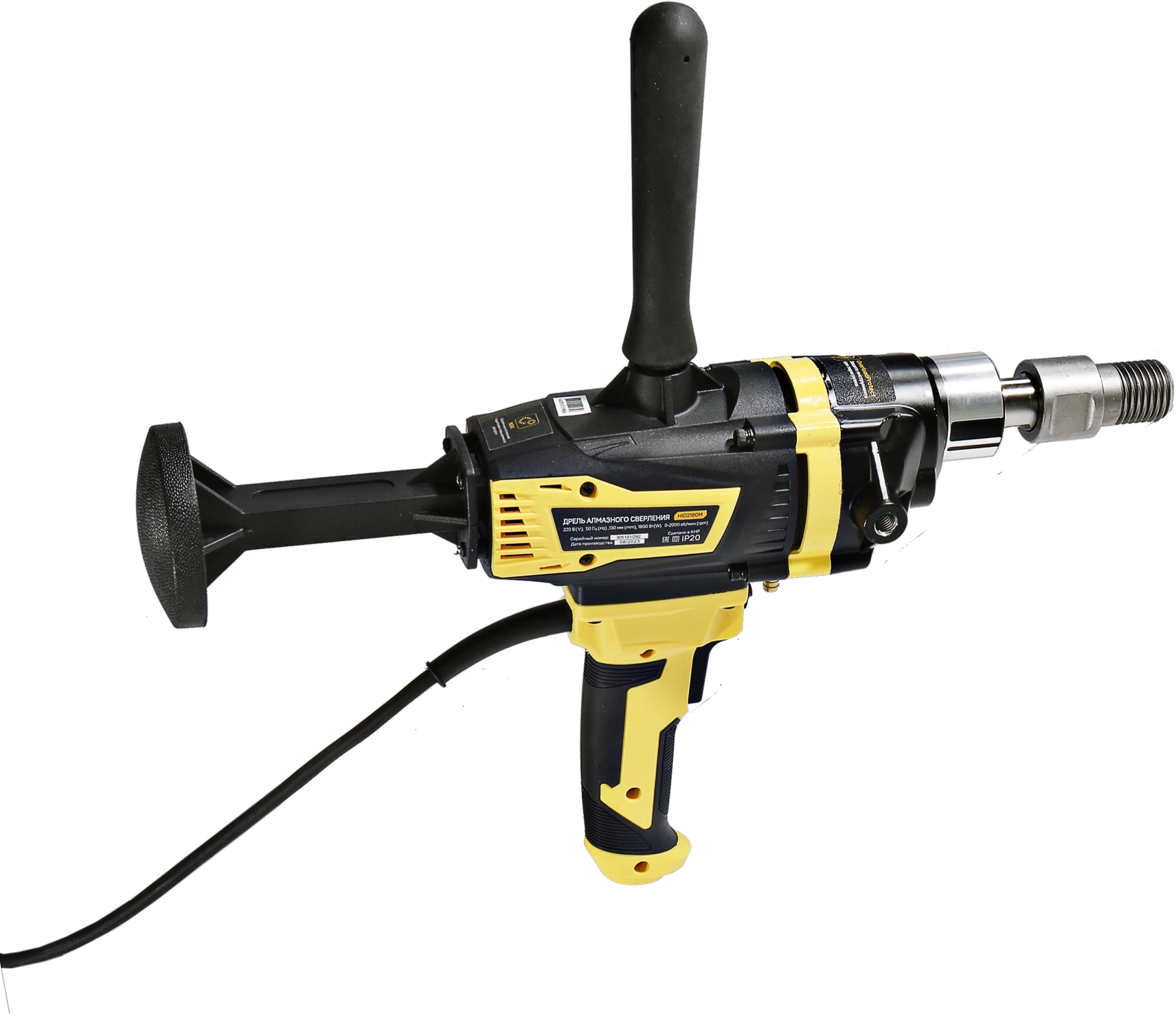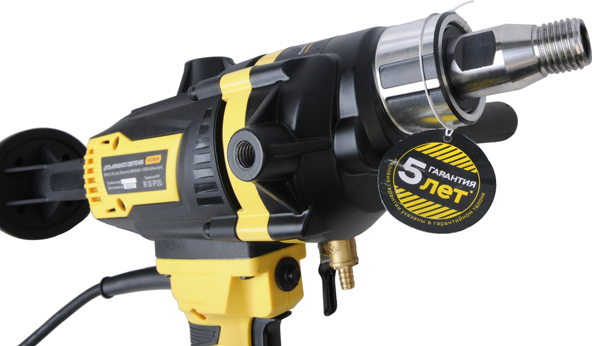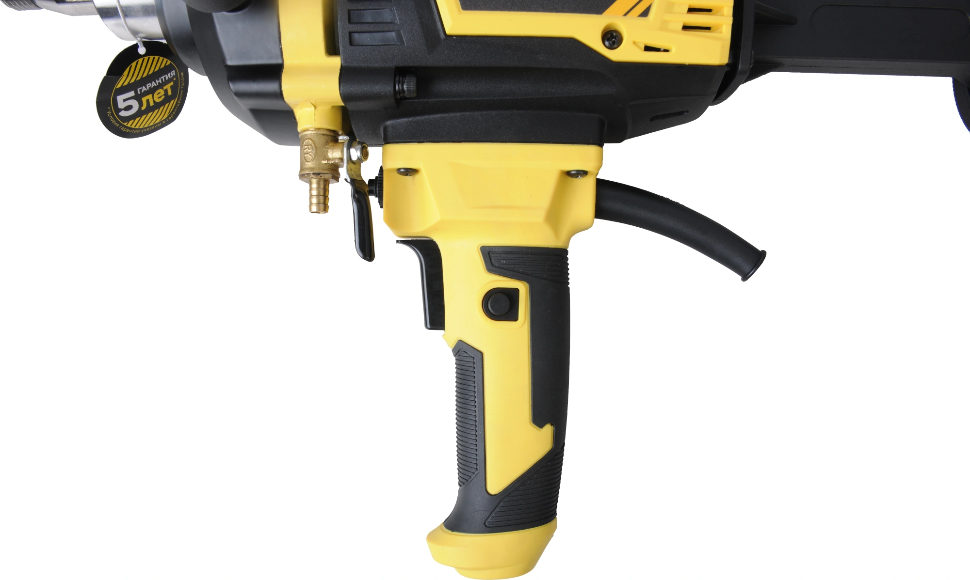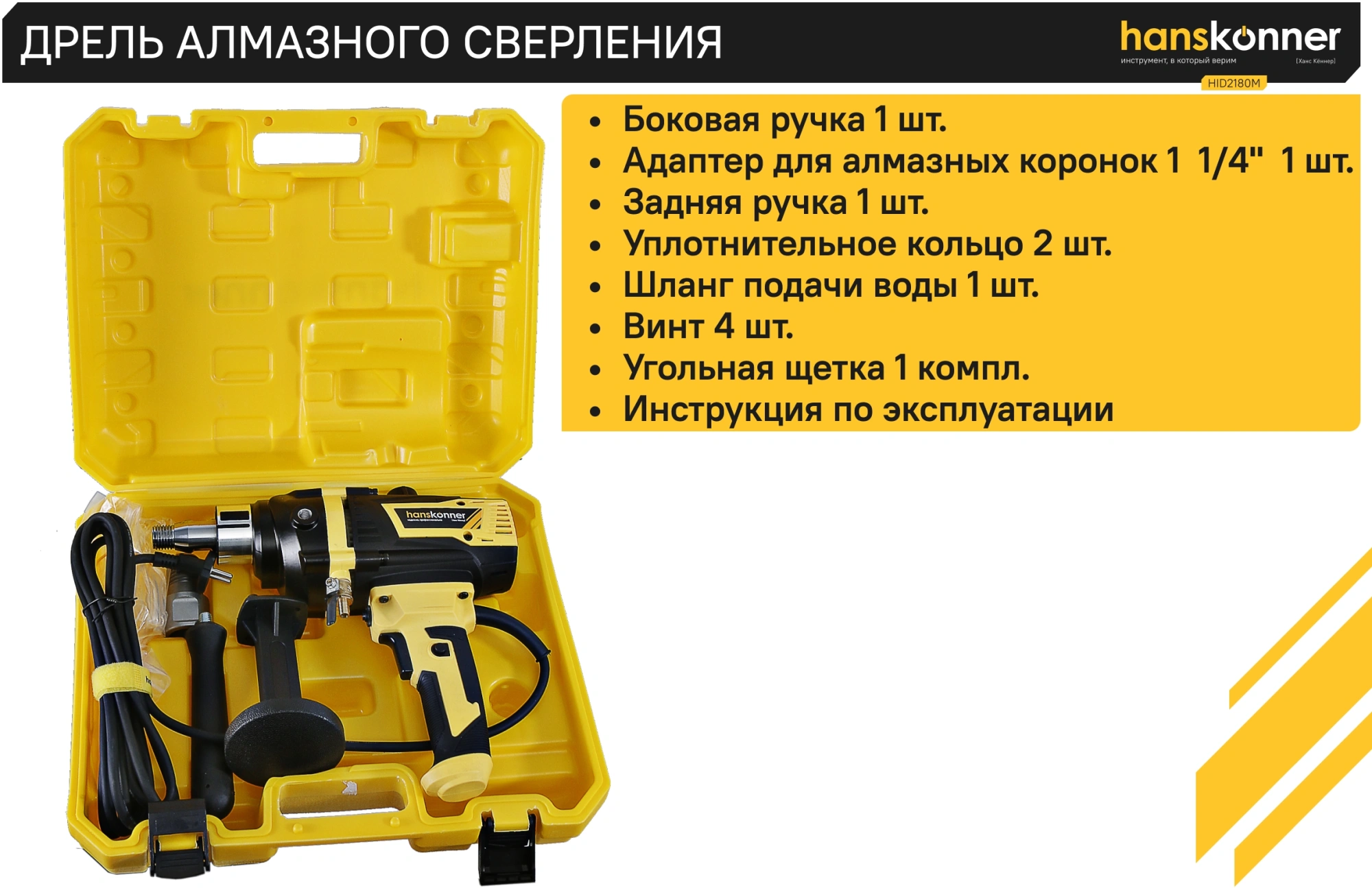 Дрель безударная, боковая ручка, адаптер для алмазных коронок 1 1/4", задняя ручка, уплотнительное кольцо - 2 шт., шланг подачи воды, винт - 4 шт., угольная щетка 1 компл., инструкция по эксплуатации, инструкция по безопасности.