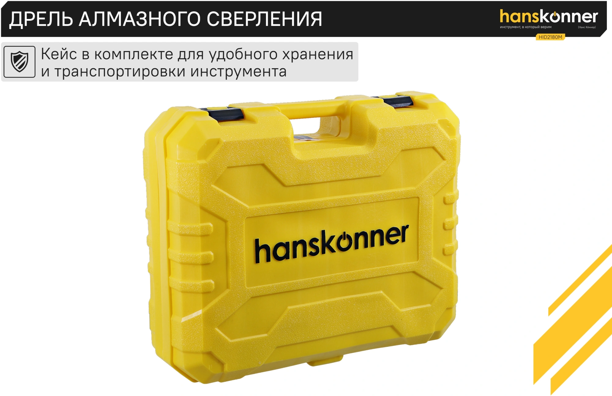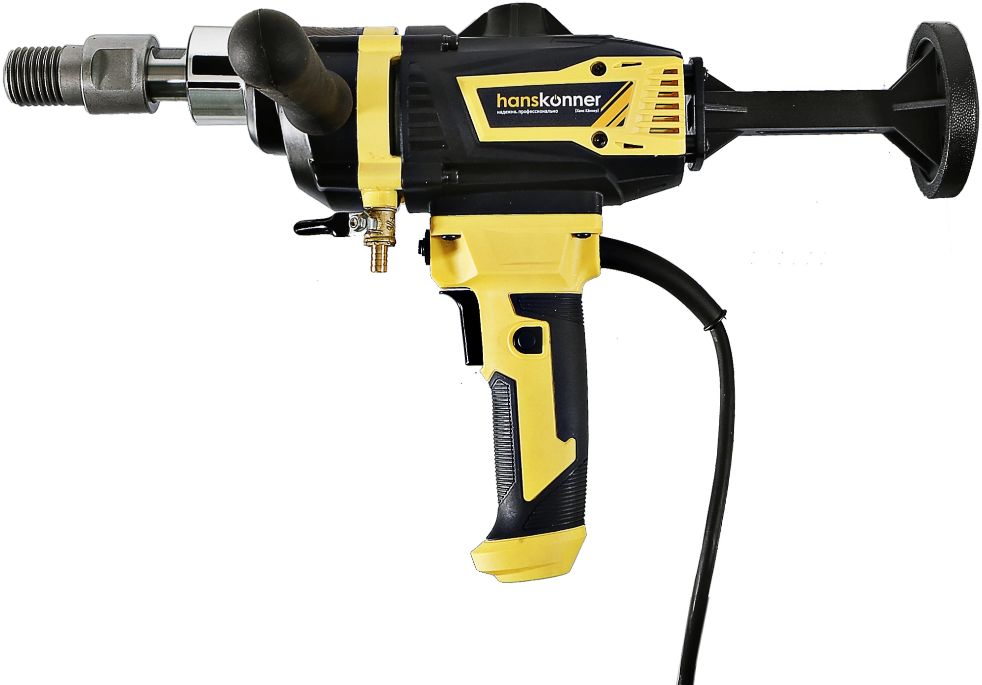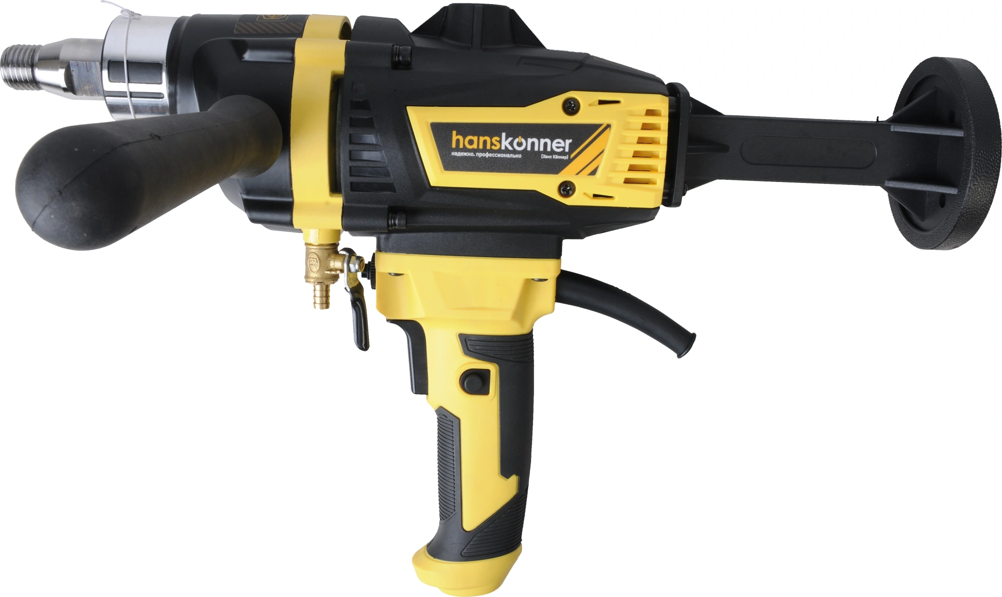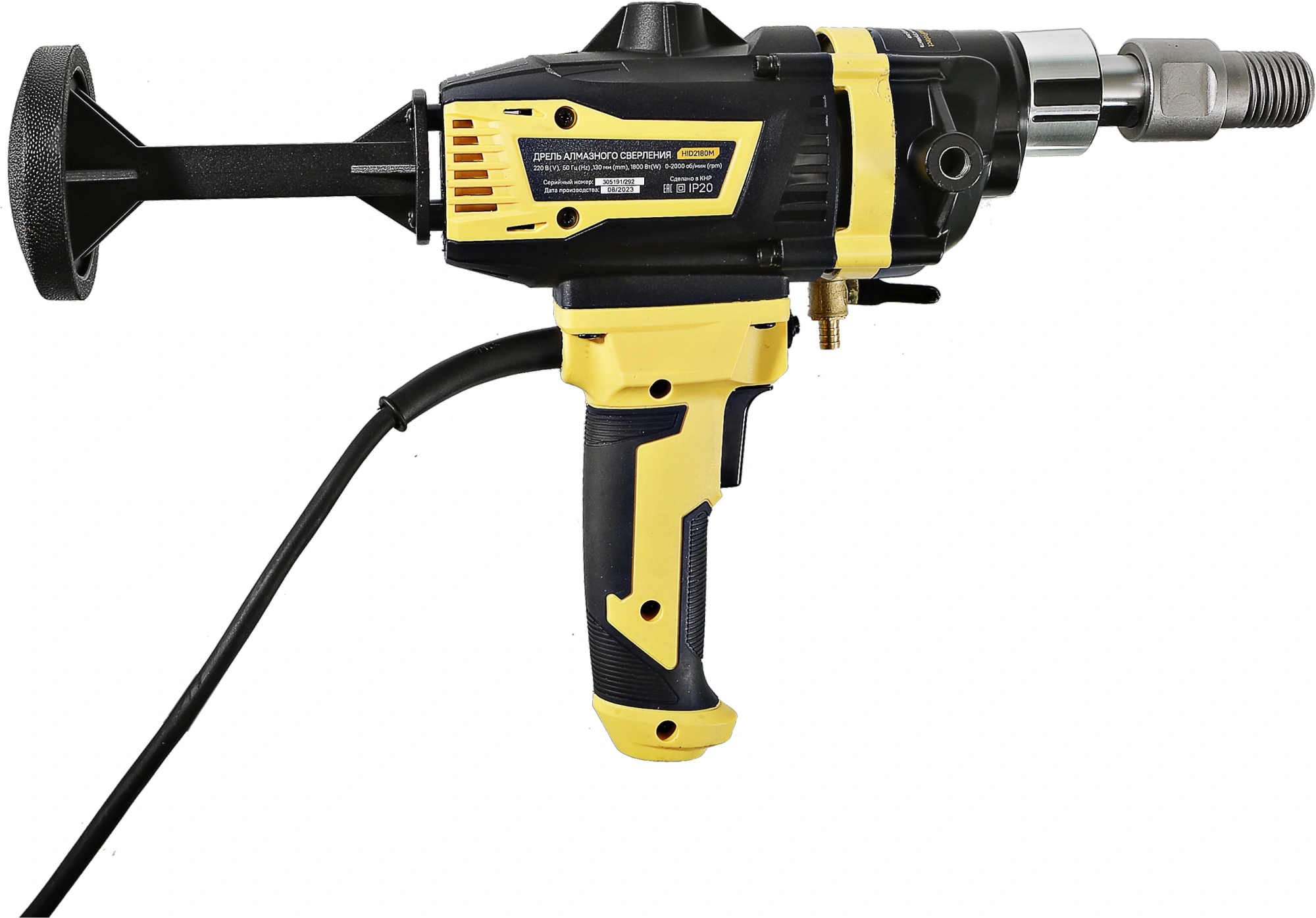 Дрель безударная, боковая ручка, адаптер для алмазных коронок 1 1/4", задняя ручка, уплотнительное кольцо - 2 шт., шланг подачи воды, винт - 4 шт., угольная щетка 1 компл., инструкция по эксплуатации, инструкция по безопасности.