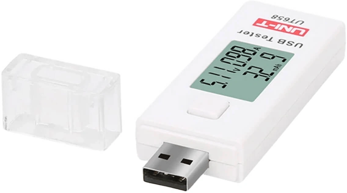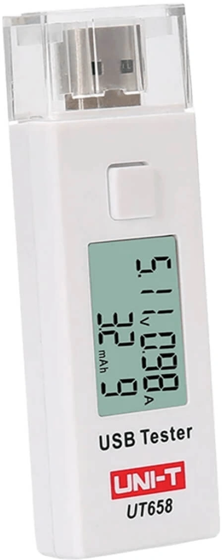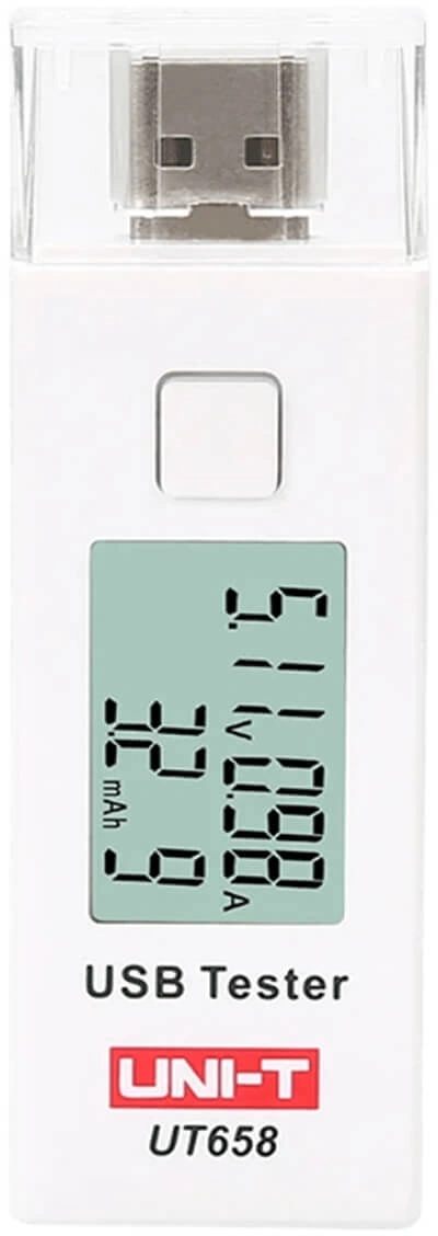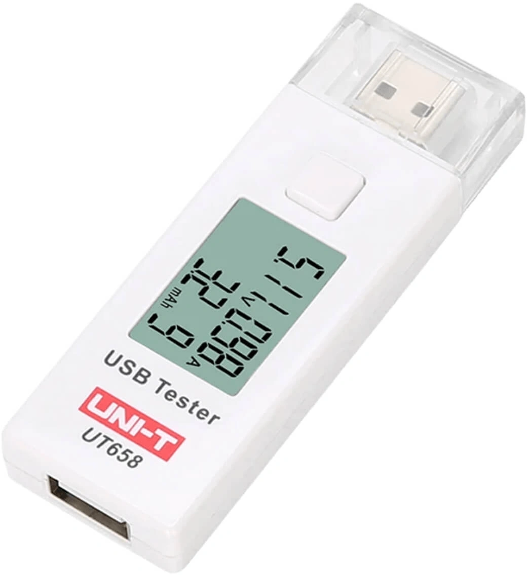 Тестер напряжения UNI-T UT658 выполненный в форм-факторе флешки с входным USB-коннектором типа A и выходным гнездом под такой же соединитель. С его помощью можно определять характеристики зарядных устройств, адаптеров, повербанков, аккумуляторов мобильных телефонов и др. гаджетов.