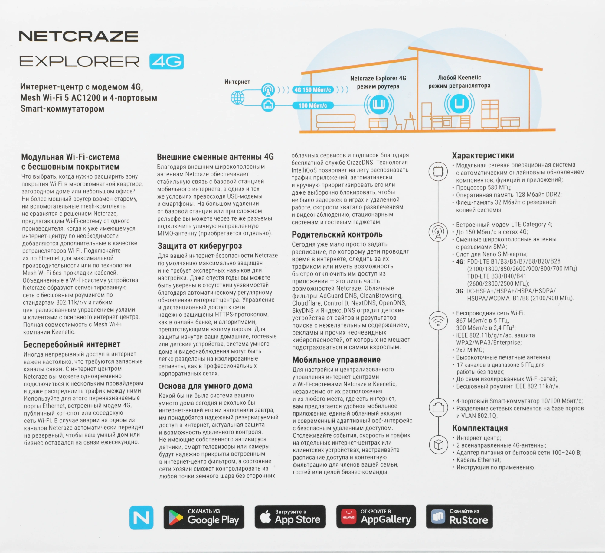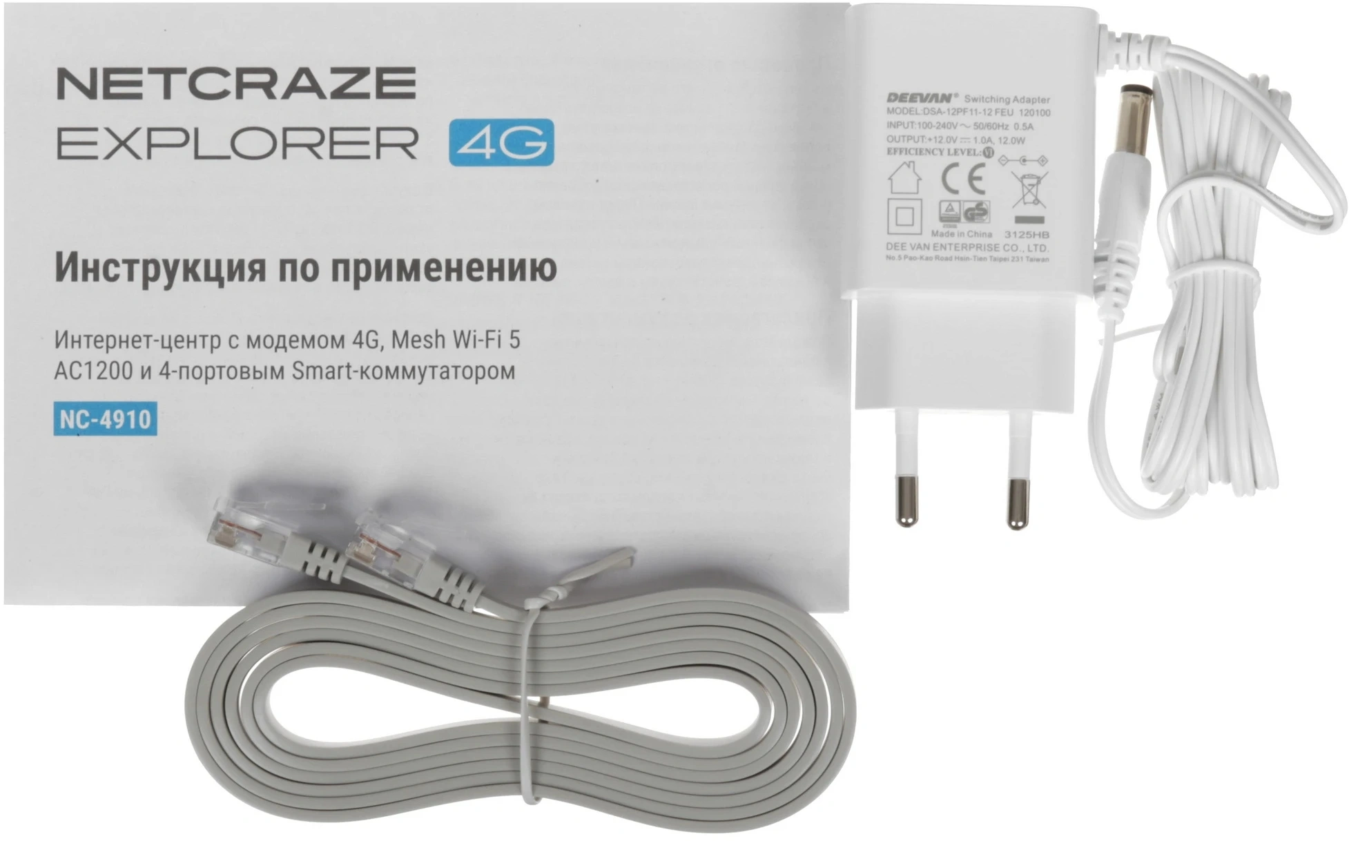 Устройство, 4G-антенны, адаптер питания: 12 В 1 A, кабель Ethernet, инструкция по применению.