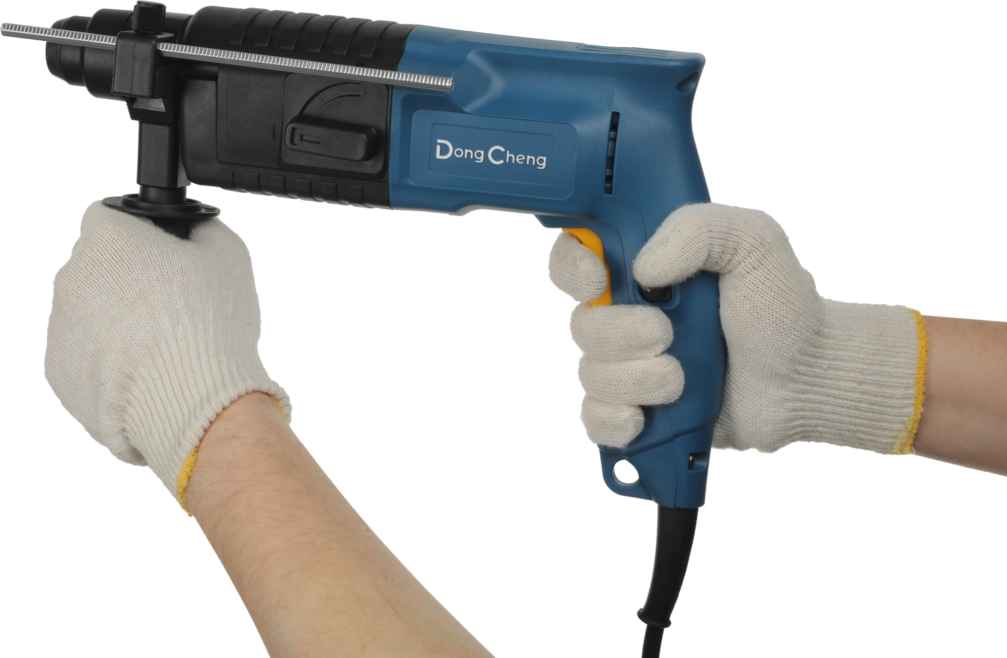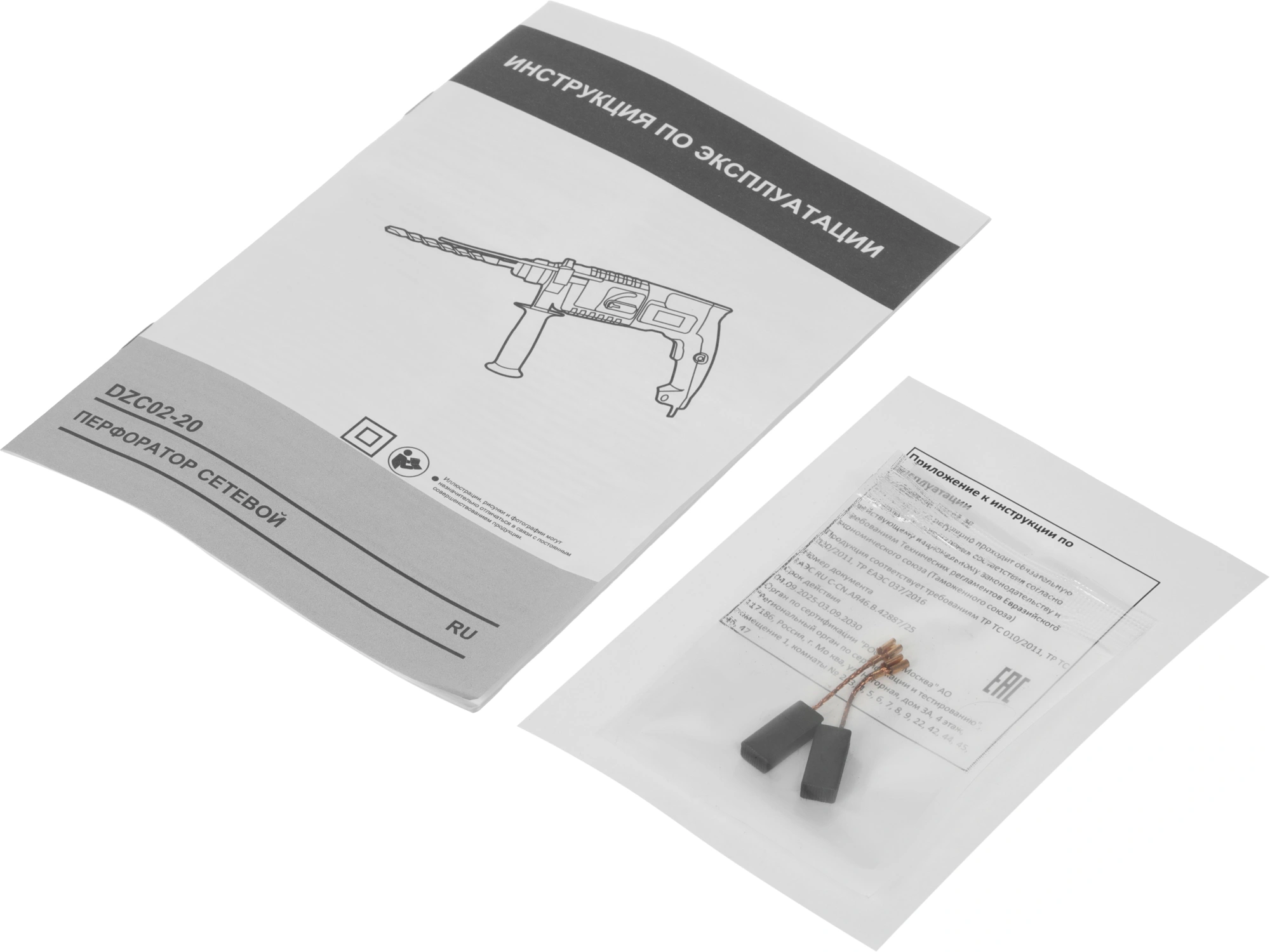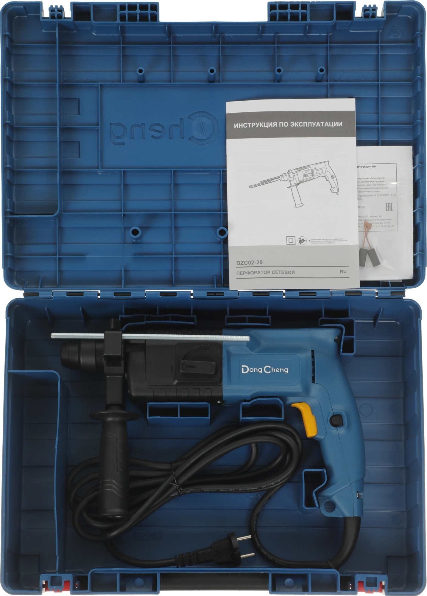 Перфоратор DZC02-20, вспомогательная рукоятка, ограничитель глубины, угольные щетки, пластиковый кейс.