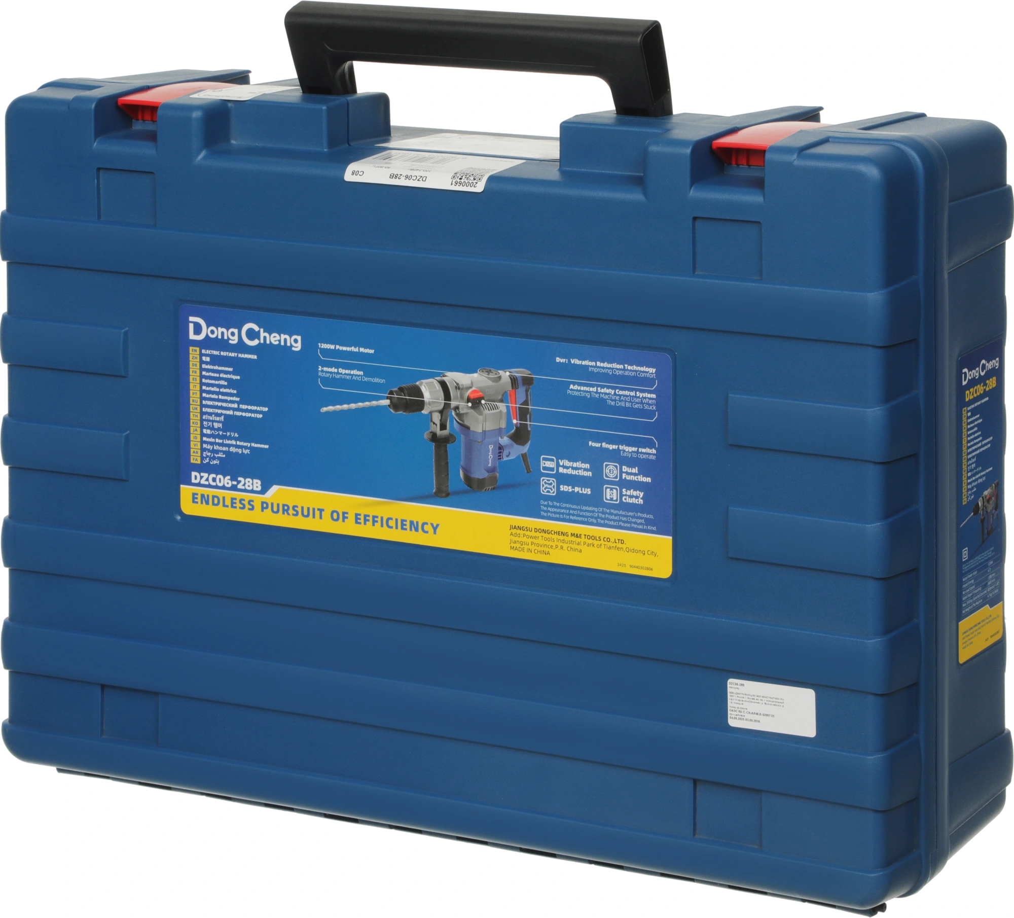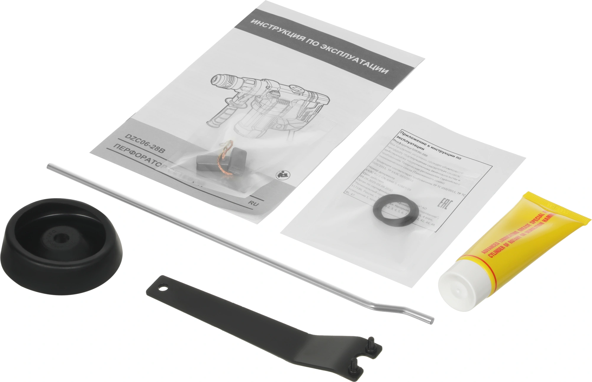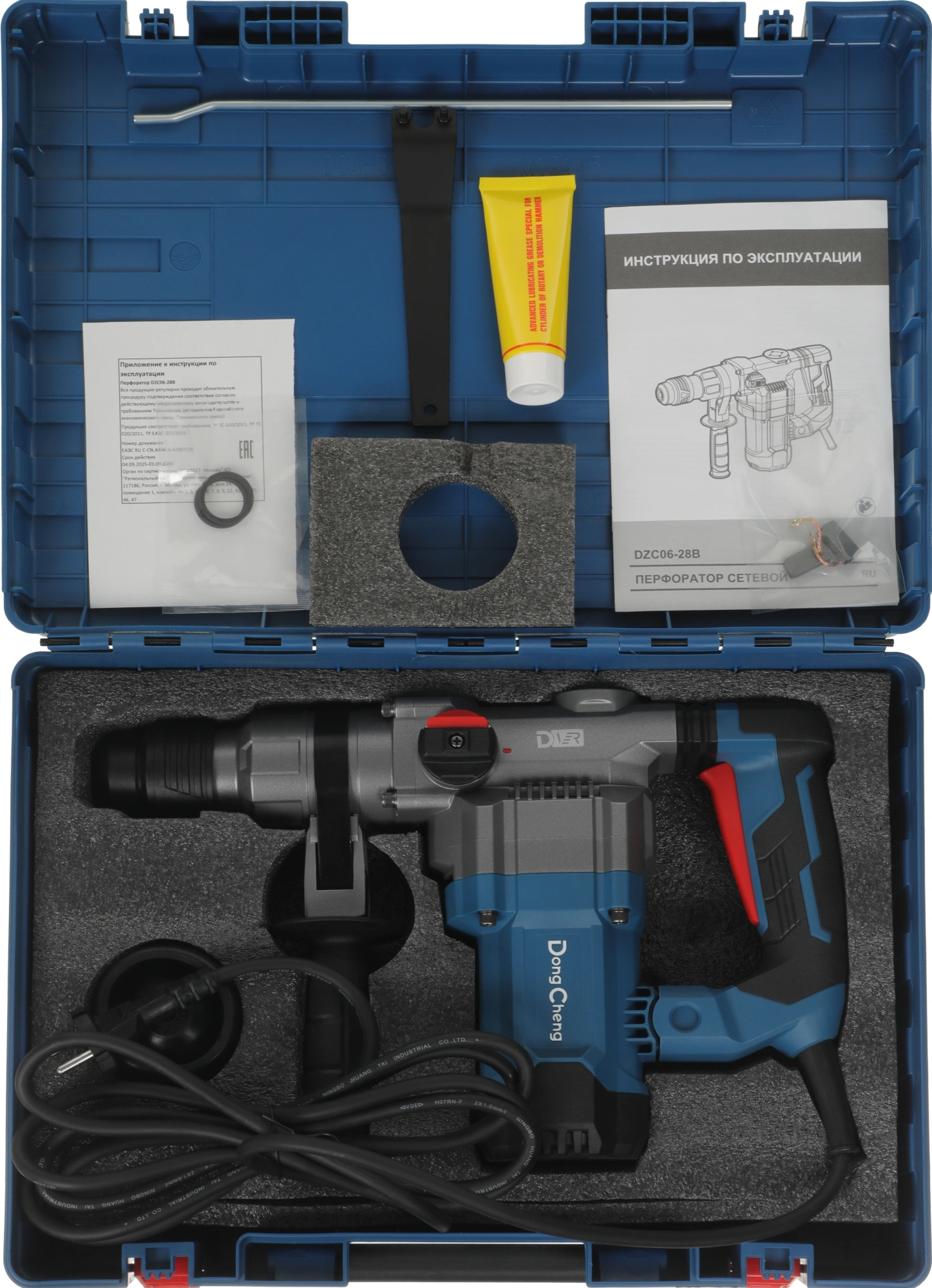Перфоратор DZC06-28B, масленка, пылезащитный колпачок, уплотнительное кольцо - 2 шт., дополнительная рукоятка, ограничитель глубины, гаечный ключ, угольные щетки, пластиковый кейс.