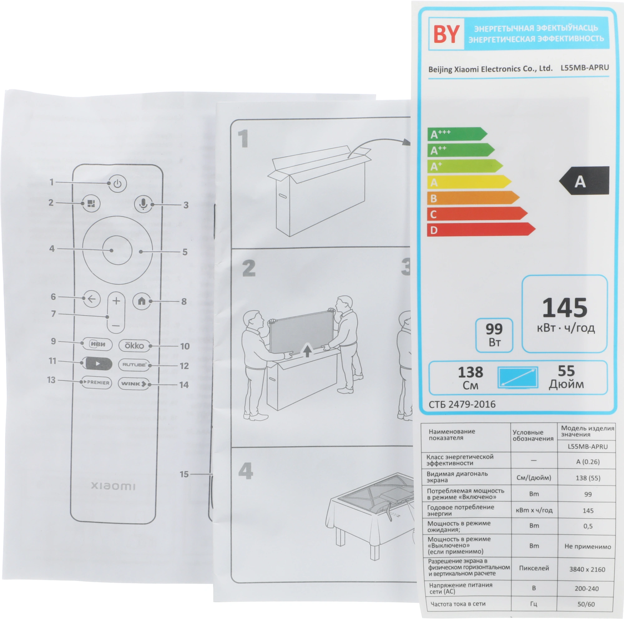Xiaomi TV x 1, 360 Bluetooth пульт управления x 1, Кабель питания x 1, Пакет с болтами X 1, Инструкция x 1, Гарантийное уведомление x 1, Компоненты подставки x 2