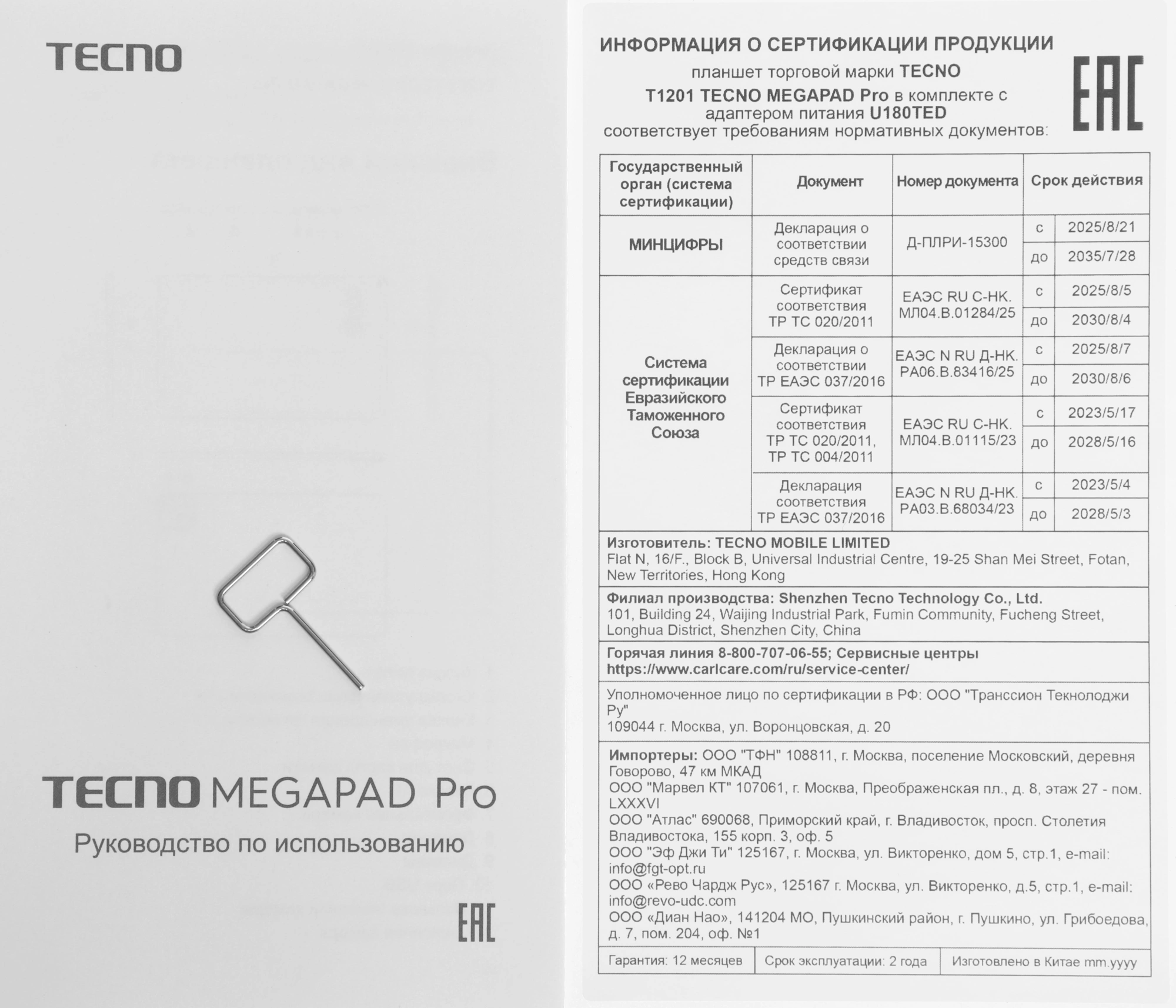 Планшет, USB-кабель, зарядное устройство, руководство пользователя